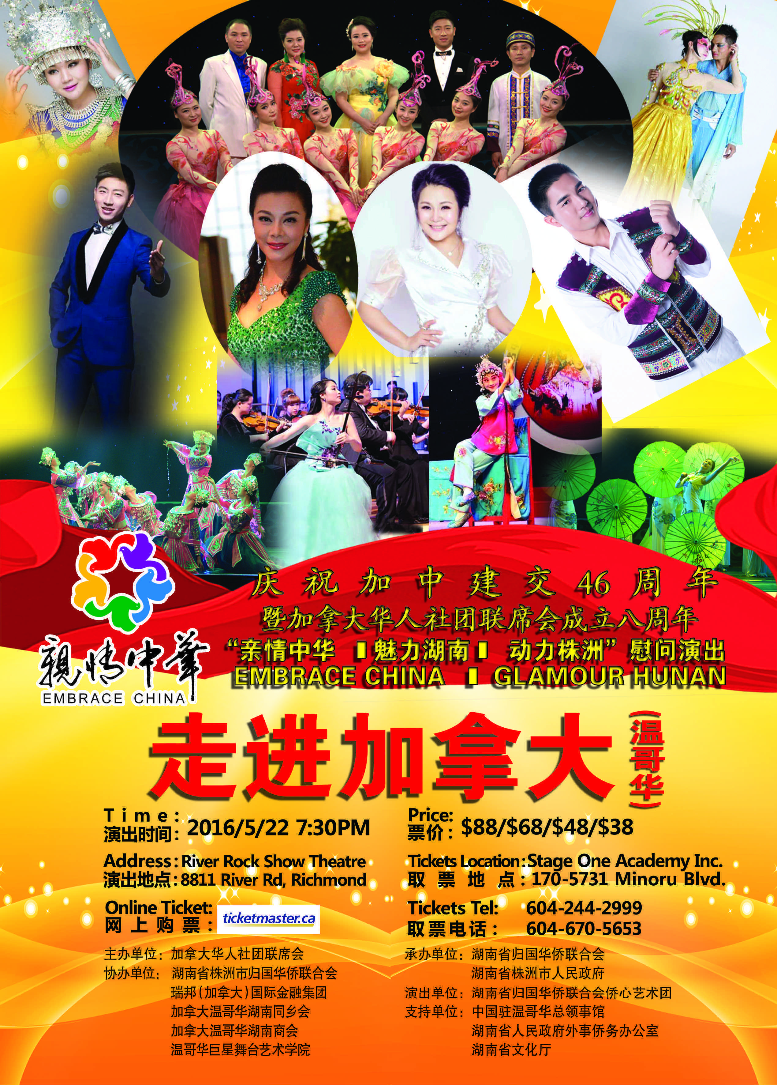 本次活动由加拿大华人社团联席会主办,湖南省归国华侨联合会、湖南省株洲市人民政府承办,得到中国驻温哥华总领事馆、湖南省人民政府外事侨务办公室及湖南省文化厅的支持,湖南省株洲市归国华侨联合会、瑞邦(加拿大)国际金融集团、加拿大温哥华湖南同乡会、加拿大温哥华湖南商会及温哥华巨星舞台艺术学院协办的“亲情中华•魅力湖南•动力株洲”大型文艺演出将于5月22日晚7点半在River Rock 河石剧场上演。