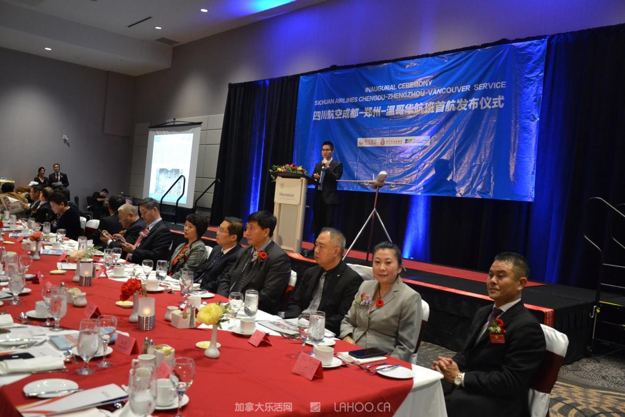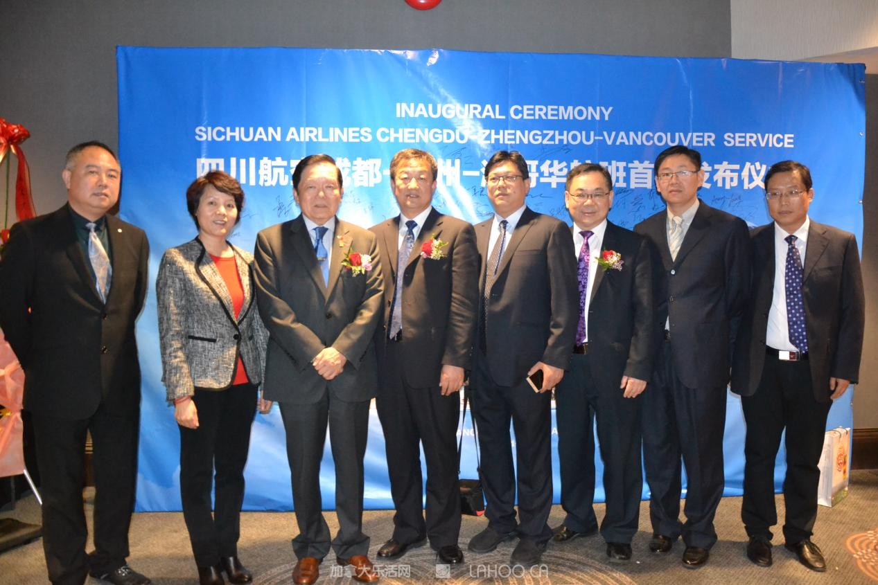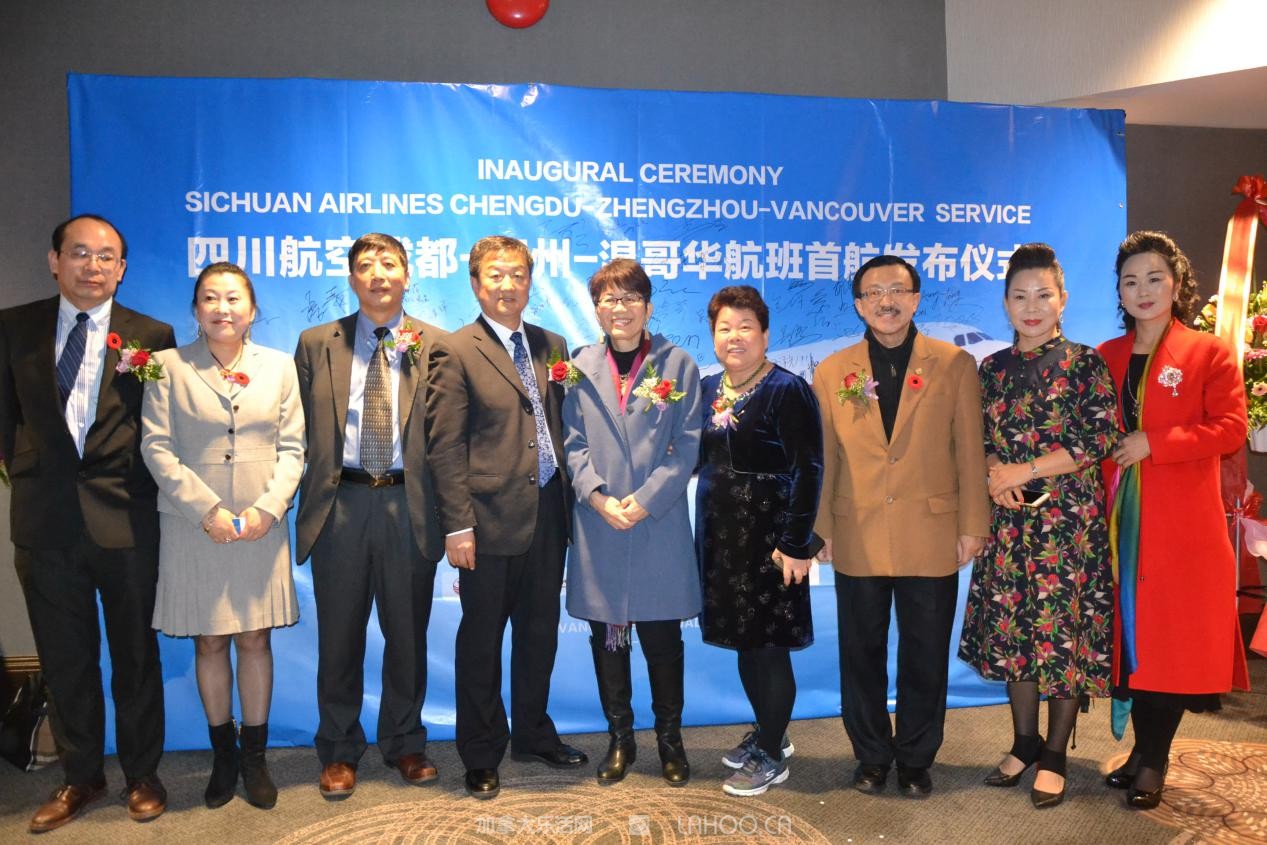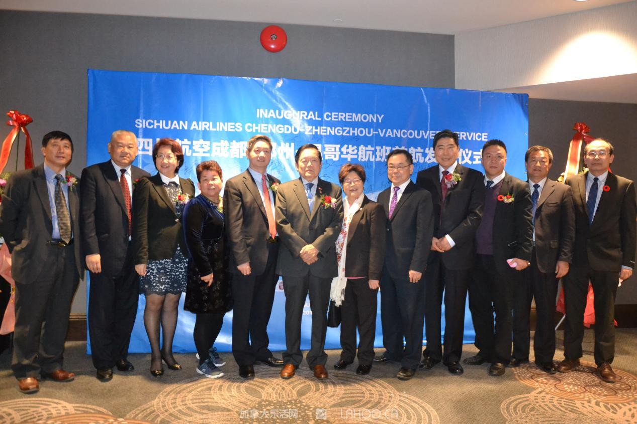 到会的嘉宾有加拿大联邦参议员胡子修、联邦议员苏立道、黄陈小萍、BC省多元文化和国际贸易厅长屈洁冰、BC省议员叶志明、列治文市议员区泽光、本拿比市议员王白进,加拿大自由党特殊顾问袁微、温哥华国际机场副总裁木丽安。中国驻温哥华总领馆余善君参赞,郑州市政府副秘书长李杰、市公安局出入境管理处长张玉舟、四川航空有限公司副总经理石坚,四川航空公司苏剑颖经理,及大温地区华人社团领袖和社会名流等300多人到场,共祝成都-郑州-温哥华航线首航成功。