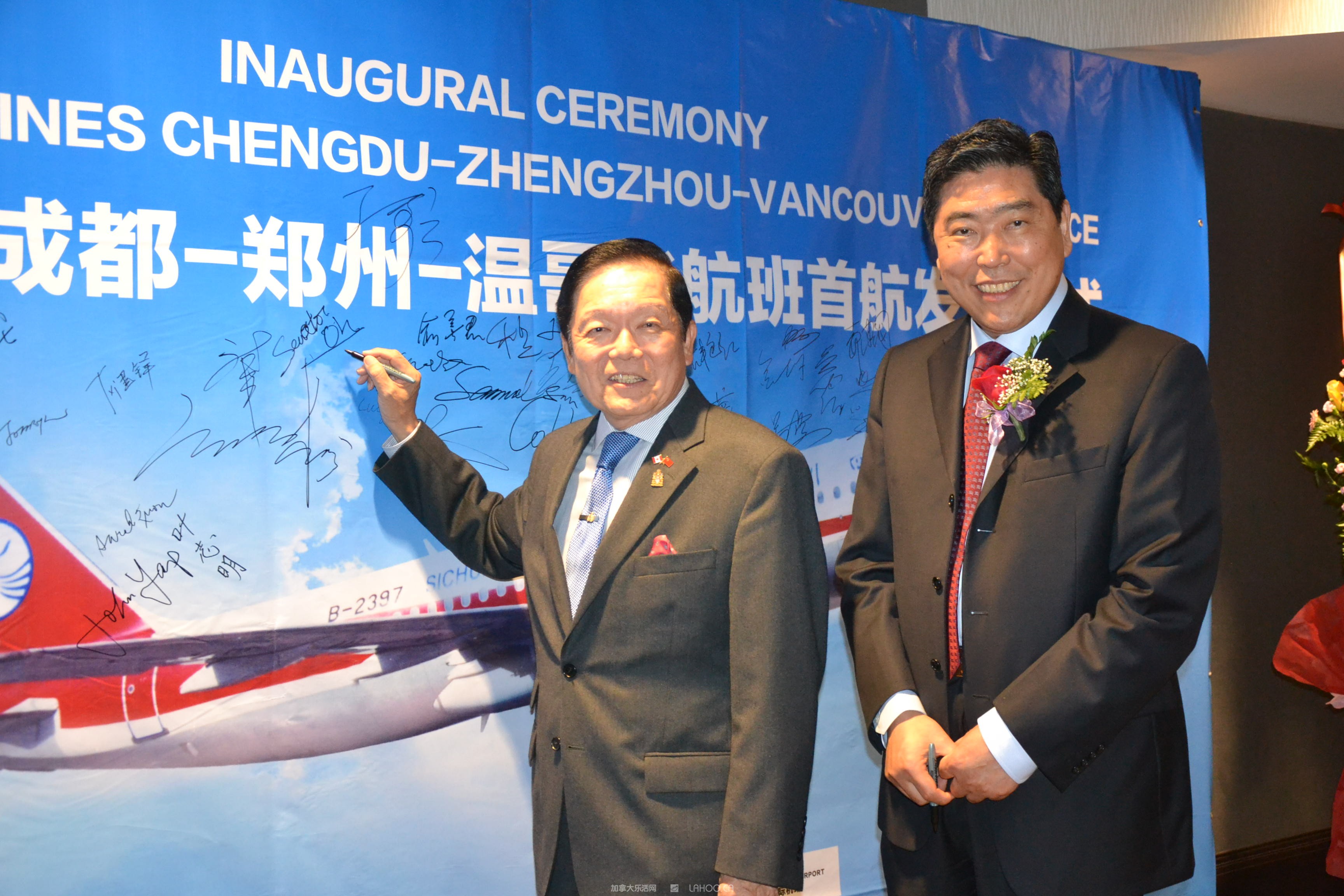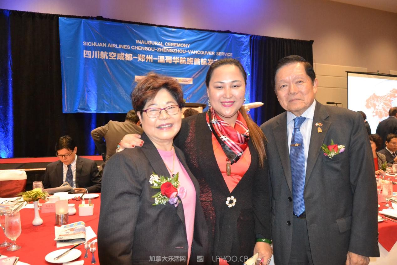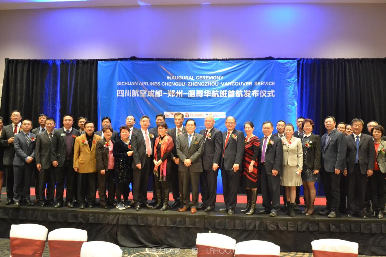 到会的嘉宾有加拿大联邦参议员胡子修、联邦议员苏立道、黄陈小萍、BC省多元文化和国际贸易厅长屈洁冰、BC省议员叶志明、列治文市议员区泽光、本拿比市议员王白进,加拿大自由党特殊顾问袁微、温哥华国际机场副总裁木丽安。中国驻温哥华总领馆余善君参赞,郑州市政府副秘书长李杰、市公安局出入境管理处长张玉舟、四川航空有限公司副总经理石坚,四川航空公司苏剑颖经理,及大温地区华人社团领袖和社会名流等300多人到场,共祝成都-郑州-温哥华航线首航成功。