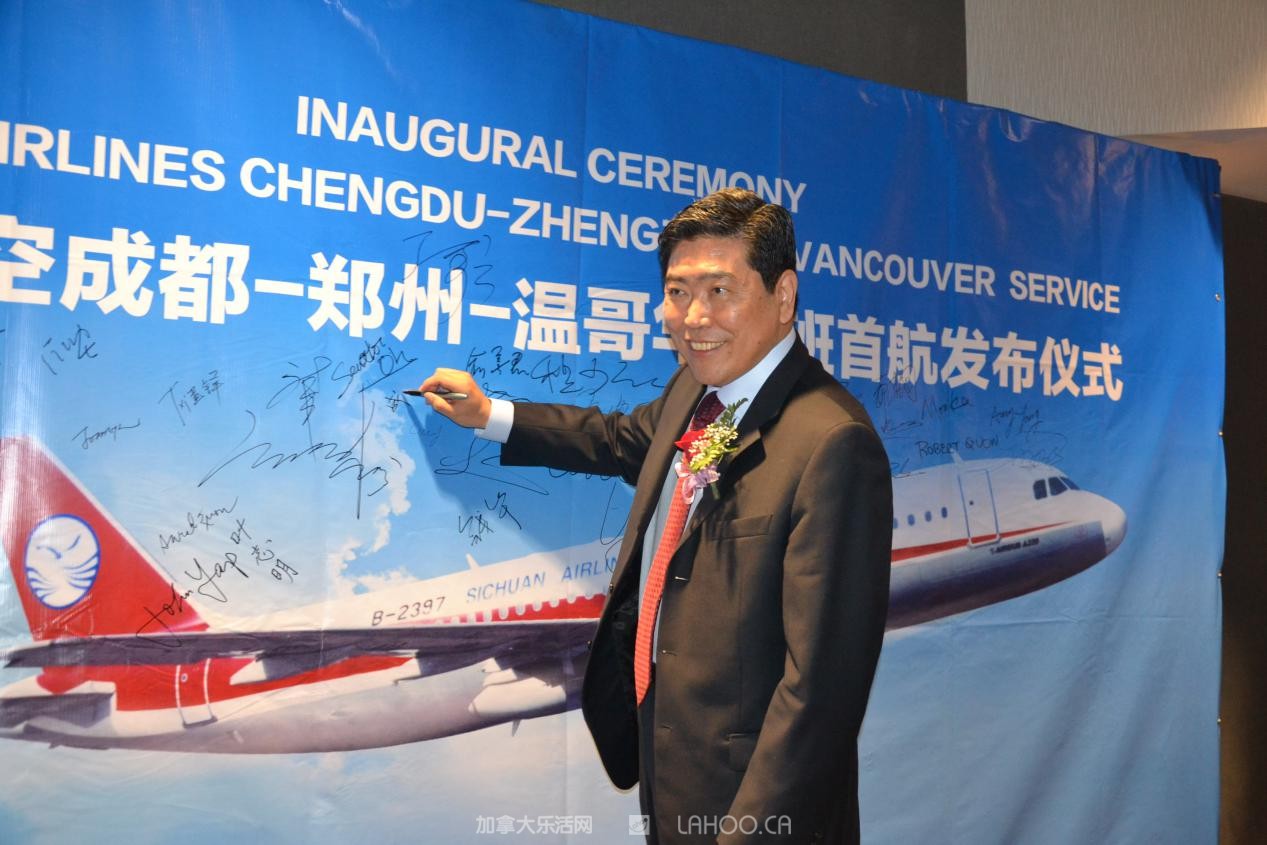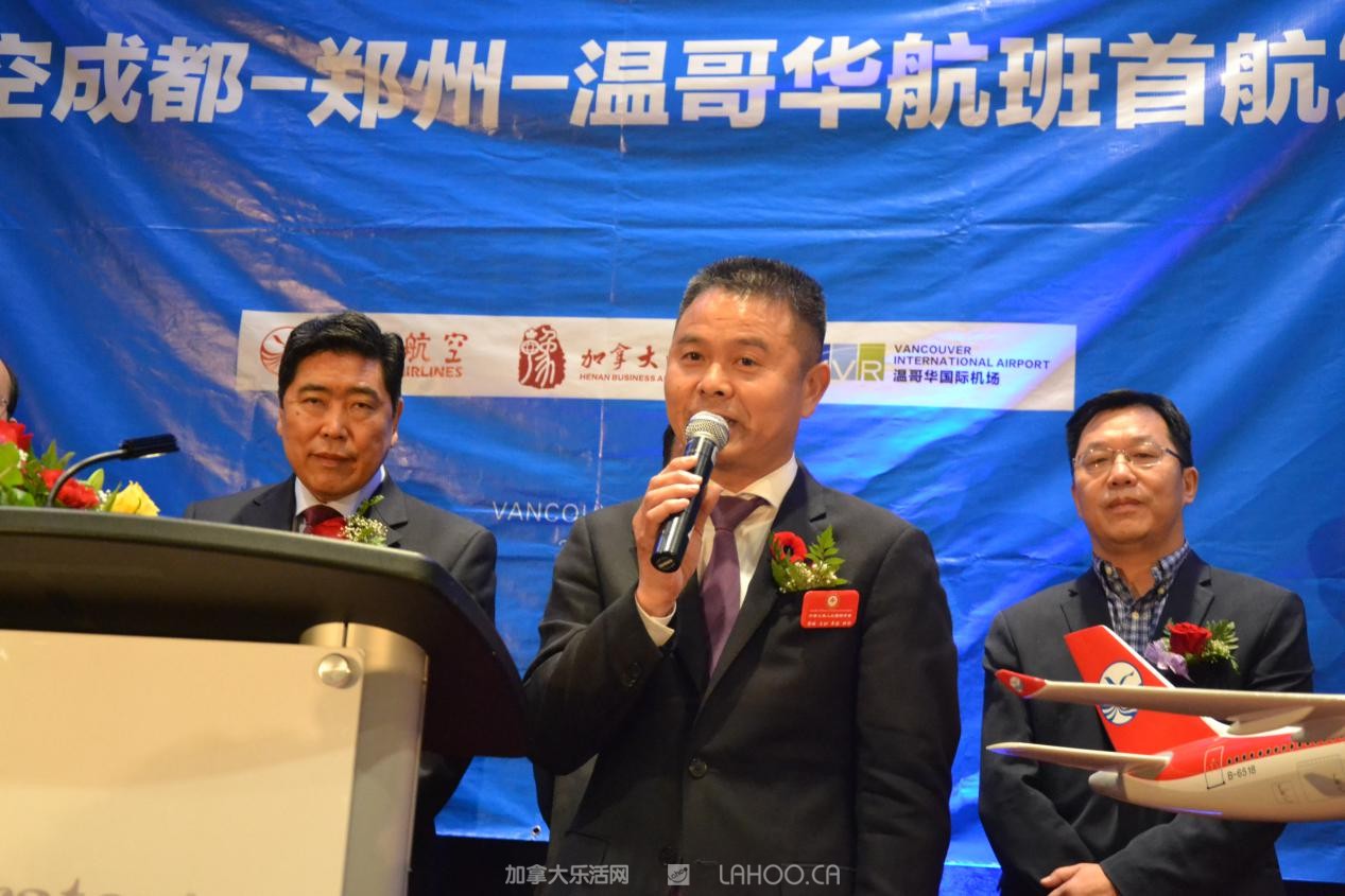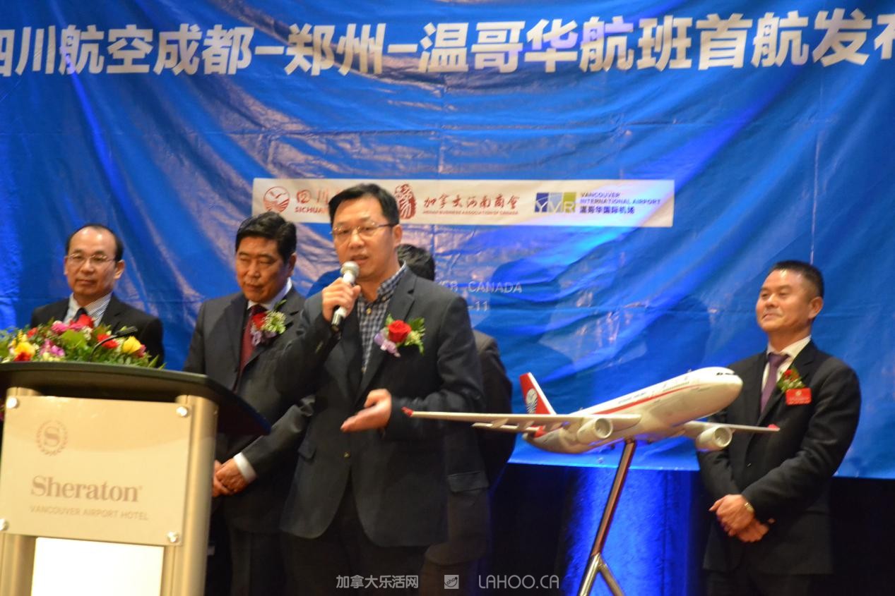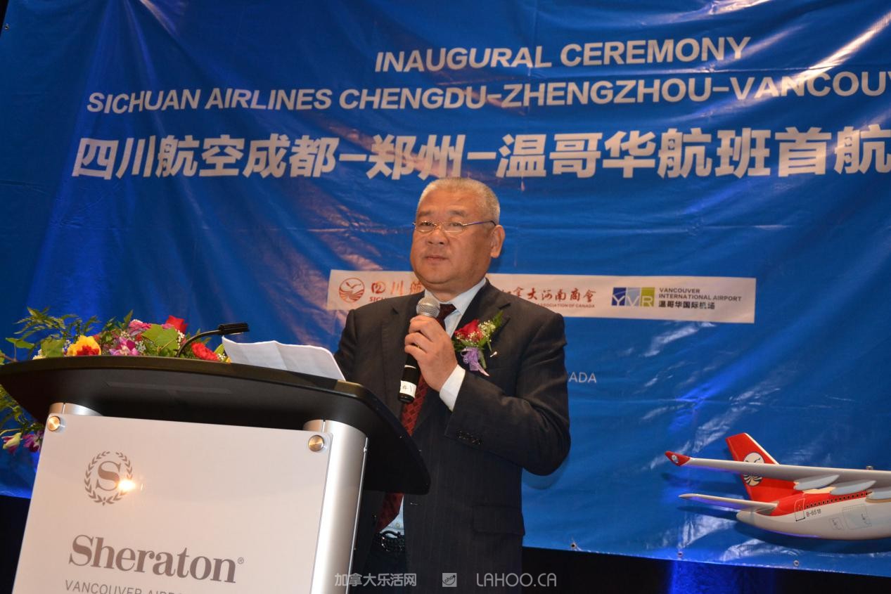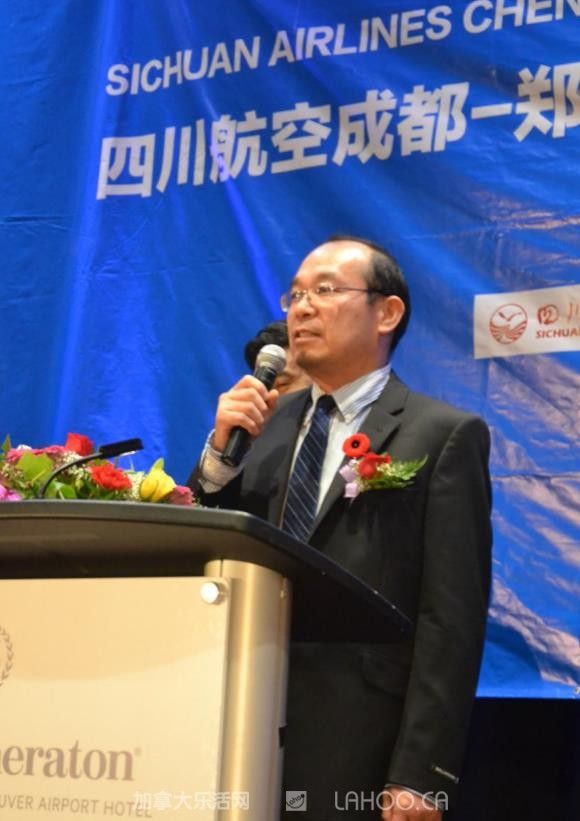 他代表四川航空衷心感谢所有到场嘉宾对川航长久以来的支持和厚爱。他强调说:“今天,四川航空携手中原大地,开通成都=郑州=温哥华航线,将对中加两国的经济、文化和旅游等多领域的交流与合作起到积极的促进作用”。