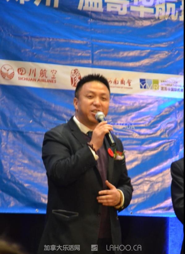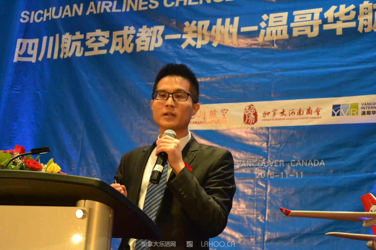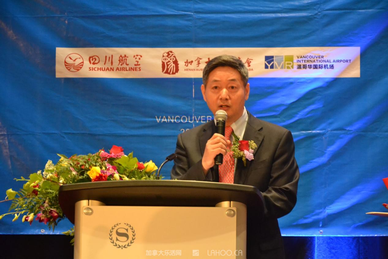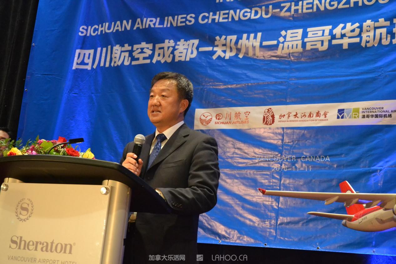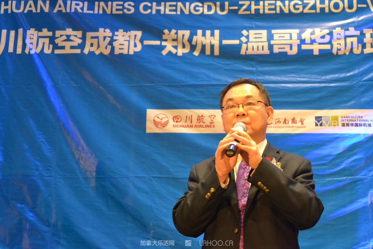 他代表四川航空衷心感谢所有到场嘉宾对川航长久以来的支持和厚爱。他强调说:“今天,四川航空携手中原大地,开通成都=郑州=温哥华航线,将对中加两国的经济、文化和旅游等多领域的交流与合作起到积极的促进作用”。
