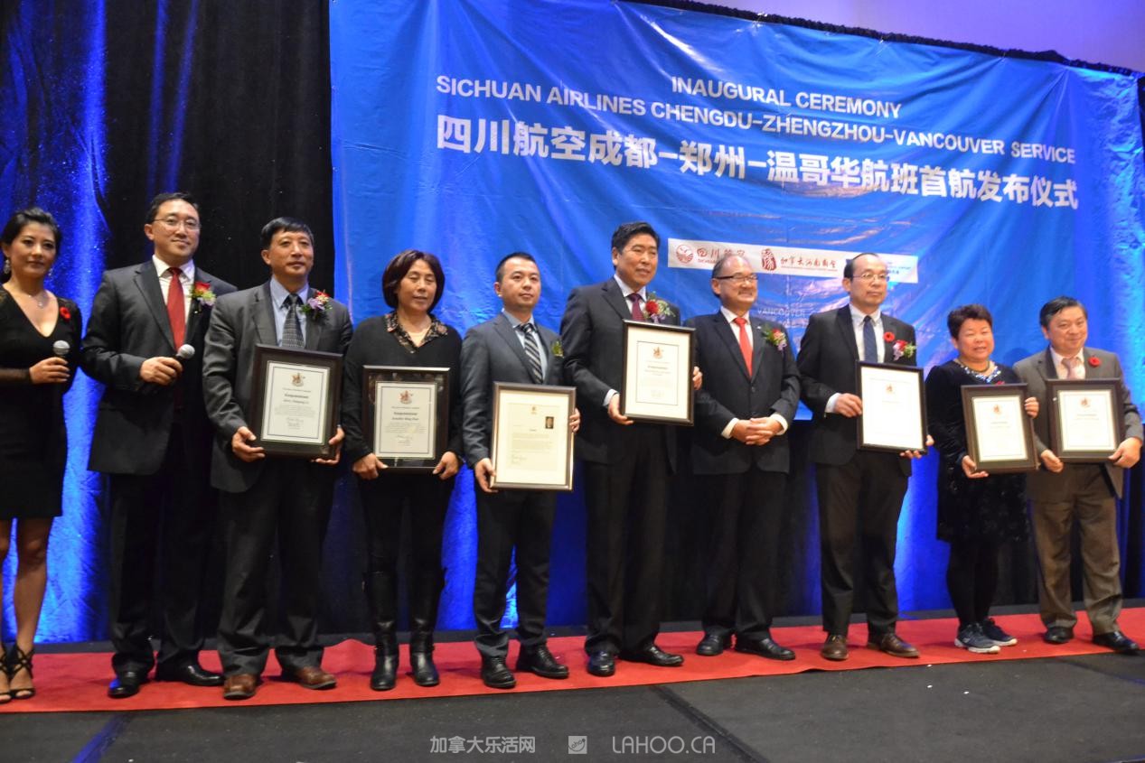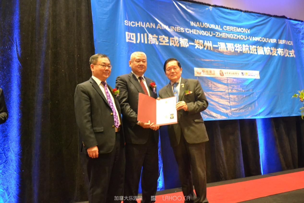 祝贺首航成功,并代表BC省多元文化和国际贸易厅,与BC省议员叶志明一起给川航颁发感谢赞美状。