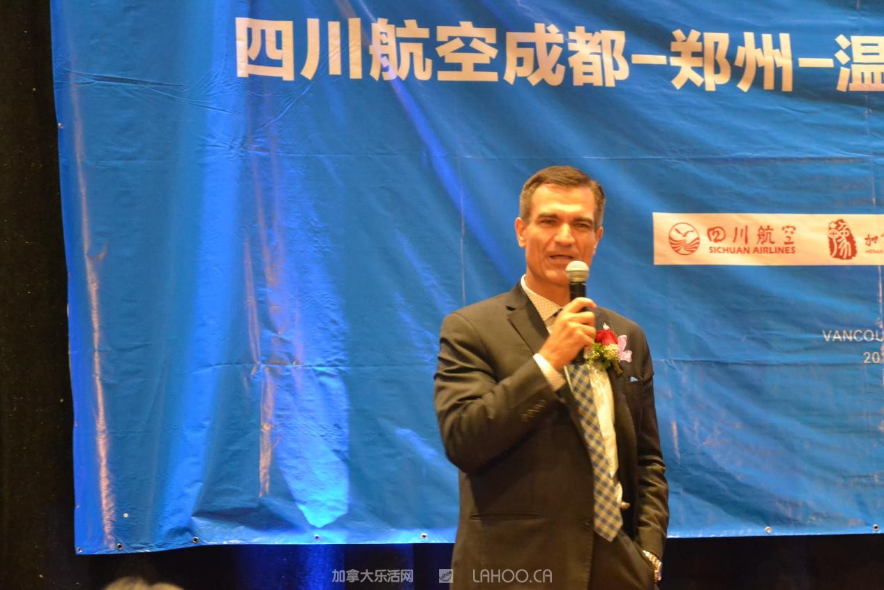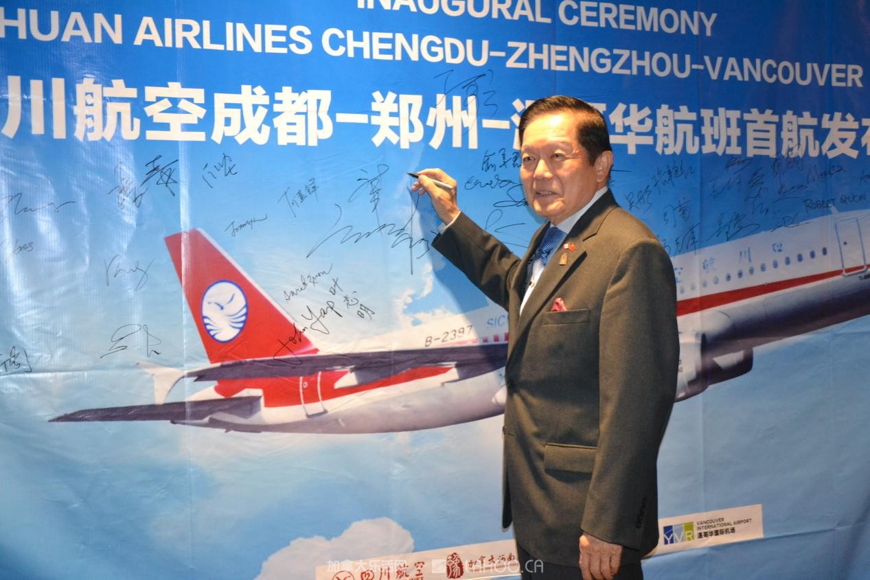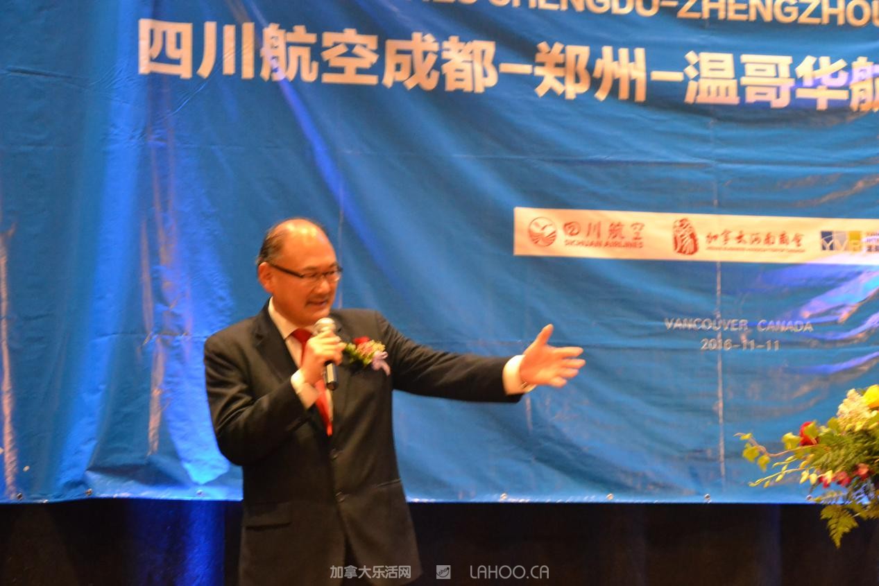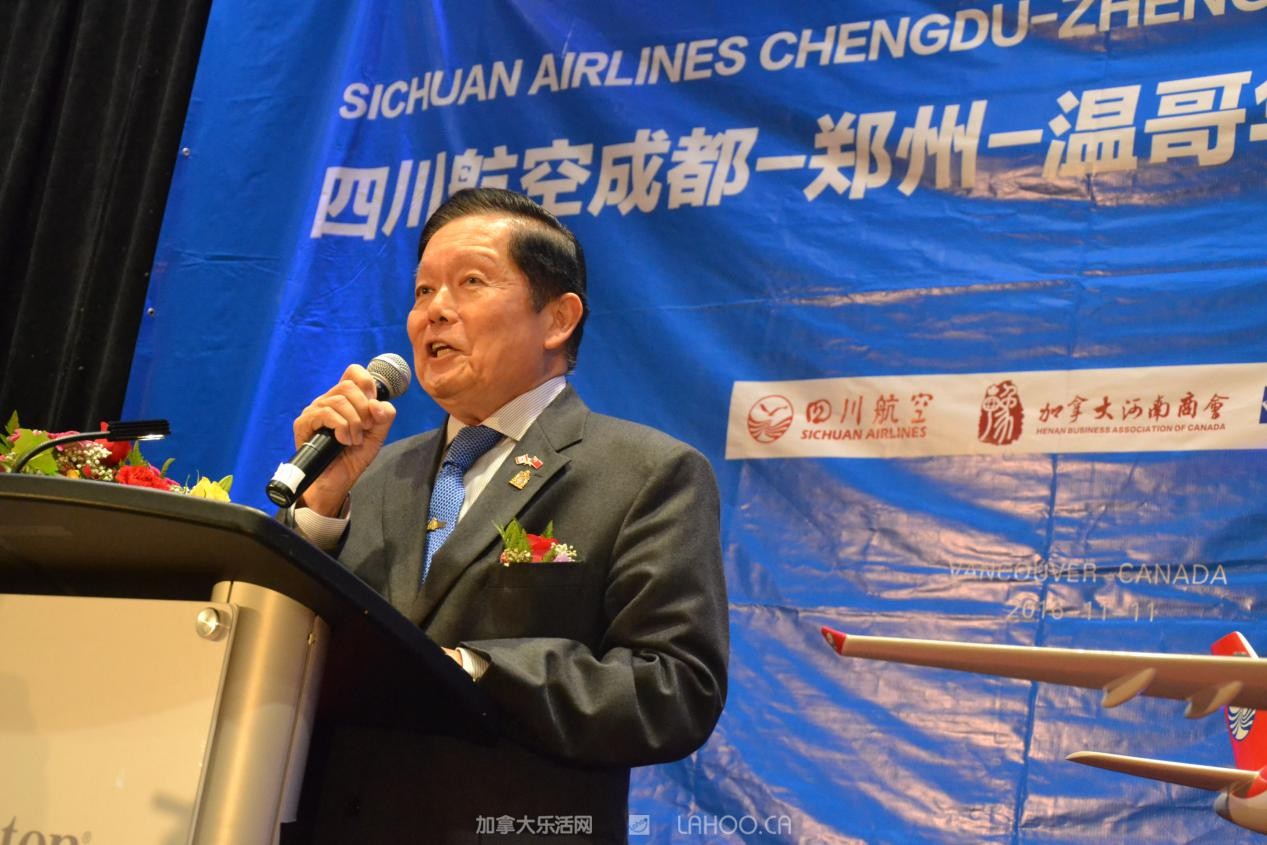 他说,中国是加拿大第二大贸易伙伴,到2025年将翻一番。郑州至温哥华航线的开通,将将进一步促进开双方经贸、文化和旅游的合作发展。他和列治文市议员区泽光乘坐川航首航班机从郑州回温哥华,感到服务优等,特此致谢。并代表加拿大联邦参议院感谢和表彰川航和区泽光议员对航线成功的努力和贡献。