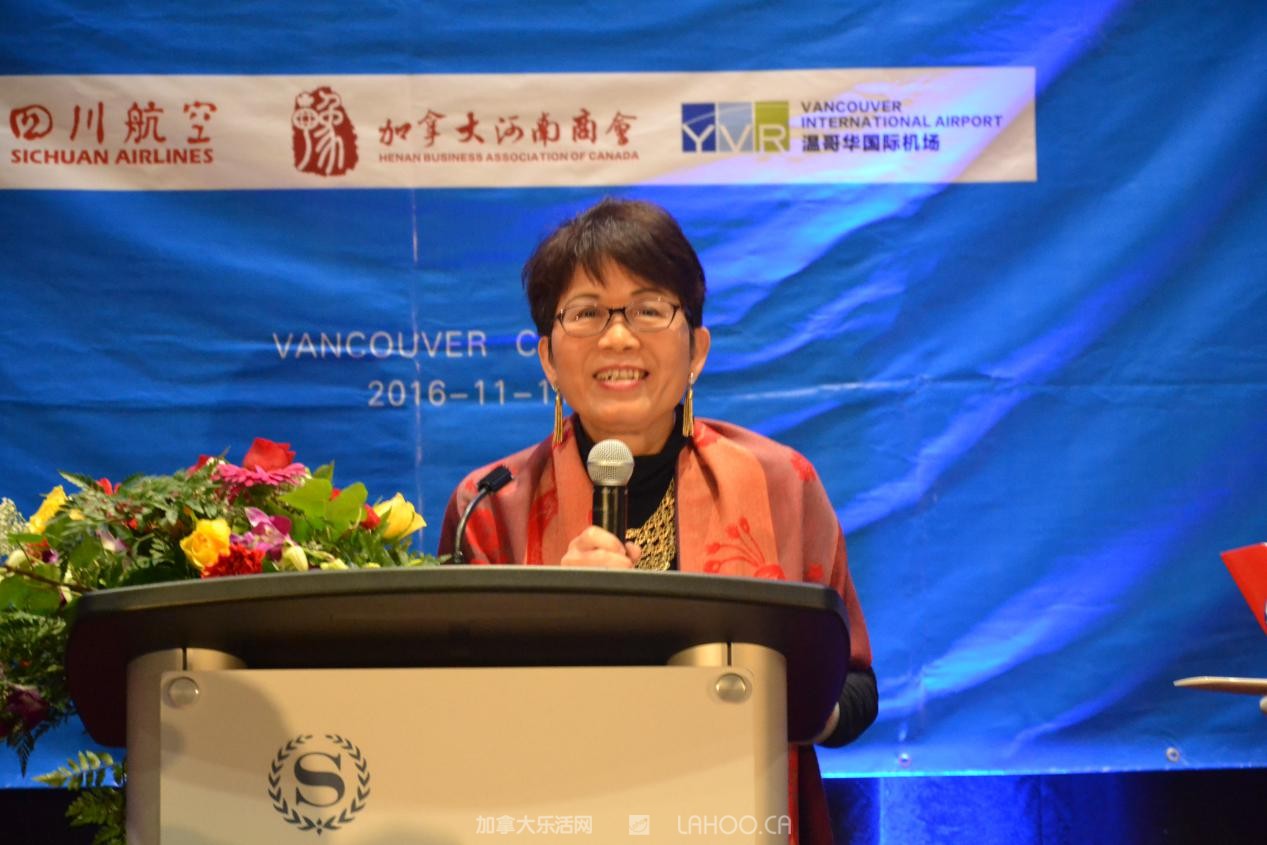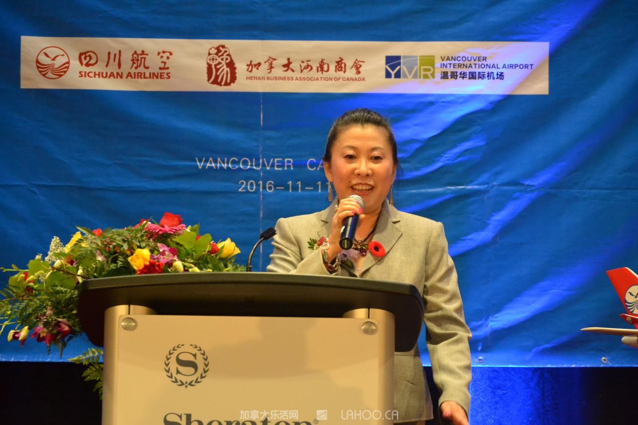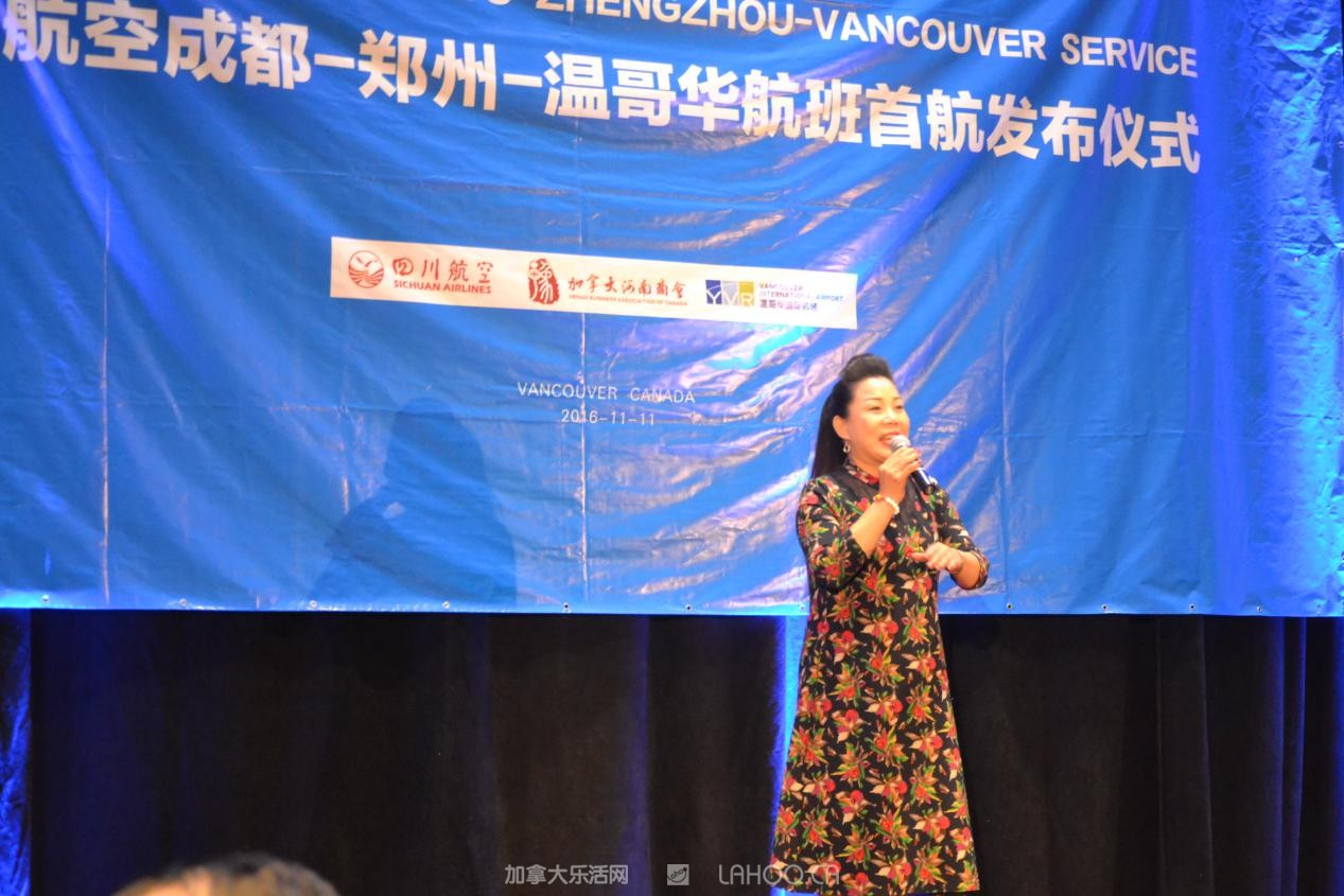 四川航空公司驻温哥华办事处经理苏剑颖介绍2016年11月11日起首航开通成都-郑州-温哥华航线情况。