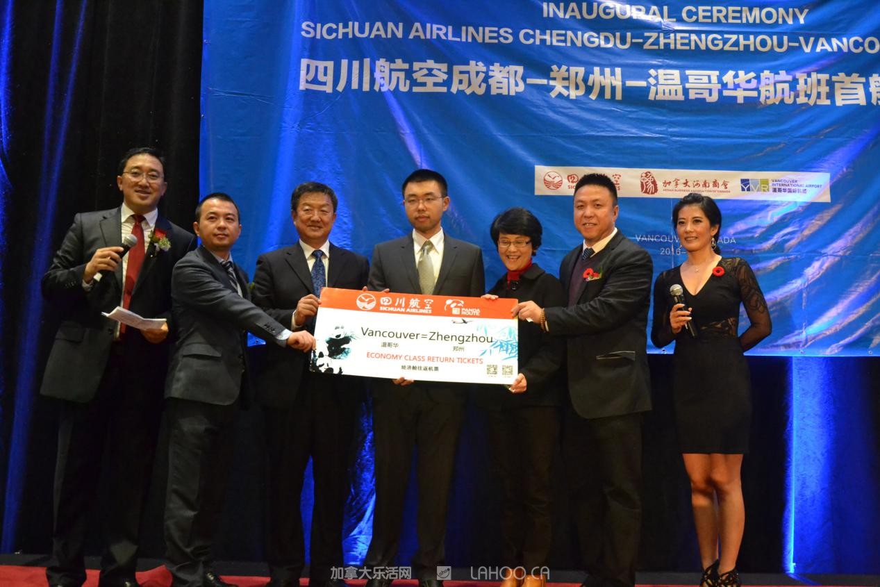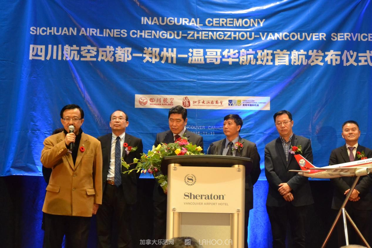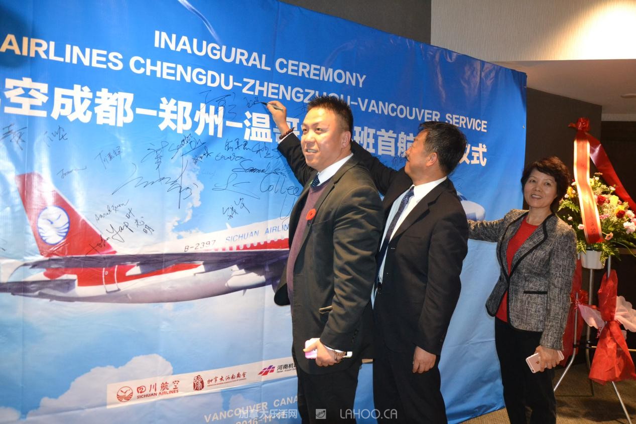 据了解。北京时间11月11日上午,四川航空公司和河南机场集团在郑州新郑国际机场T2航站楼举行简短仪式,庆祝郑州至温哥华洲际航线正式开通。河南省副省长赵建才宣布郑州至温哥华航线开通。在首航仪式上,加拿大联邦参议员胡子修和列治文市议员代市长区泽光出席首航仪式并讲了话,说“郑州至温哥华航线的开通,将打开双方商贸、文化和旅游的直接通道,促进两国两地友好合作的发展”。13时25分,首个航班3U8501飞机从郑州新郑国际机场起飞,温哥华时间11月11日上午8点多平安直达温哥华国际机场。该航线是郑州新郑国际机场开通的第一条洲际直飞航线。(完)