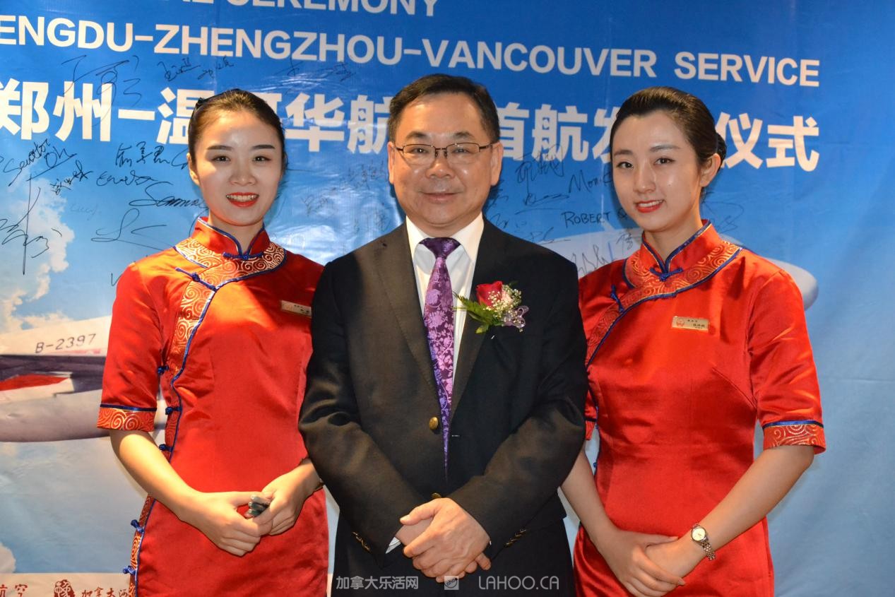 在这三年期间,他开始到温哥华国际机场管理处去敲门拜访;先后10次往返中国与加拿大之间斡旋;2014年7月,亲自带领一个代表团直接去郑州,在这当中,双方做了大量的对接协调工作,解决了不少难题,直到今年3月,郑州空港经济试验区书记张延明先生来访温哥华。张书记非常重视开通温哥华-郑州航线,各种筹备工作,一步一步落实了,终于今天顺利开通了温哥华至郑州至成都的航线。