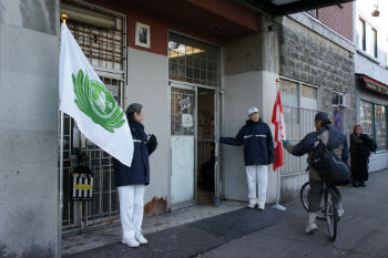 志工分工合作快速布置现场,恬妮师姊及岳华师兄放下明星的光环,帮忙搬旗杆、整理桌面;今天更是多了二位就读温哥华国际中医学院的林猷宪、陈建融二位年轻志工来帮忙。虽然他们明天(9日)就要期末考试,但是他们还是把握付出的机会加入发放行列,带着满满法喜迎接明天期末考试。