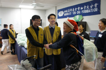 志工彭美萍感恩大家有缘齐聚一堂,提早庆祝圣诞节的来临。美萍师姊向大家解说这些礼物:「是由慈济所有会员捐款购买的,带着众人的爱心,志工用心选购夹克、帽子、内裤、袜子、牙刷及牙膏,设想周到的放进防水背袋,方便𢹂带及使用,期待用心挑选的礼物,大家会満意喜欢。」