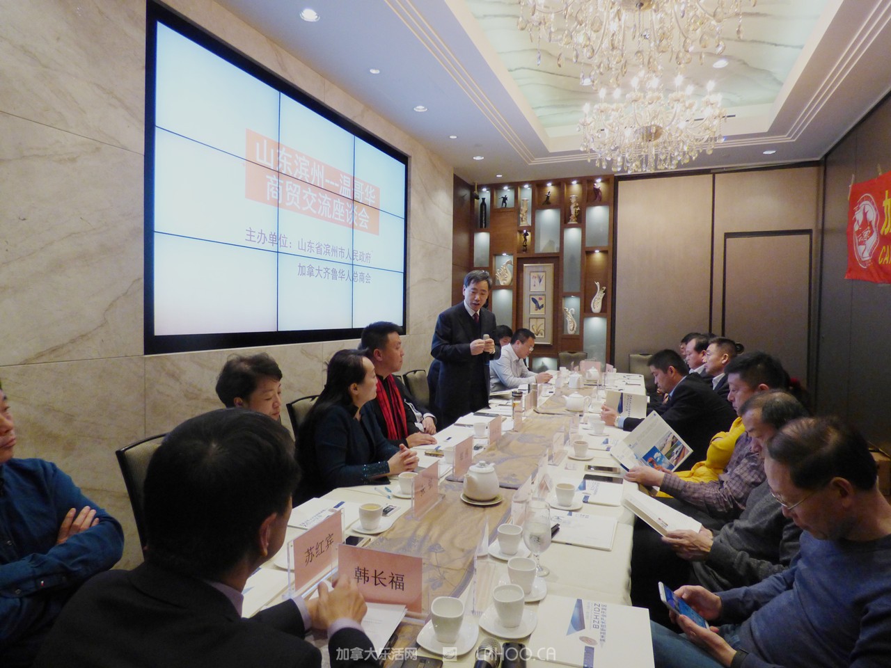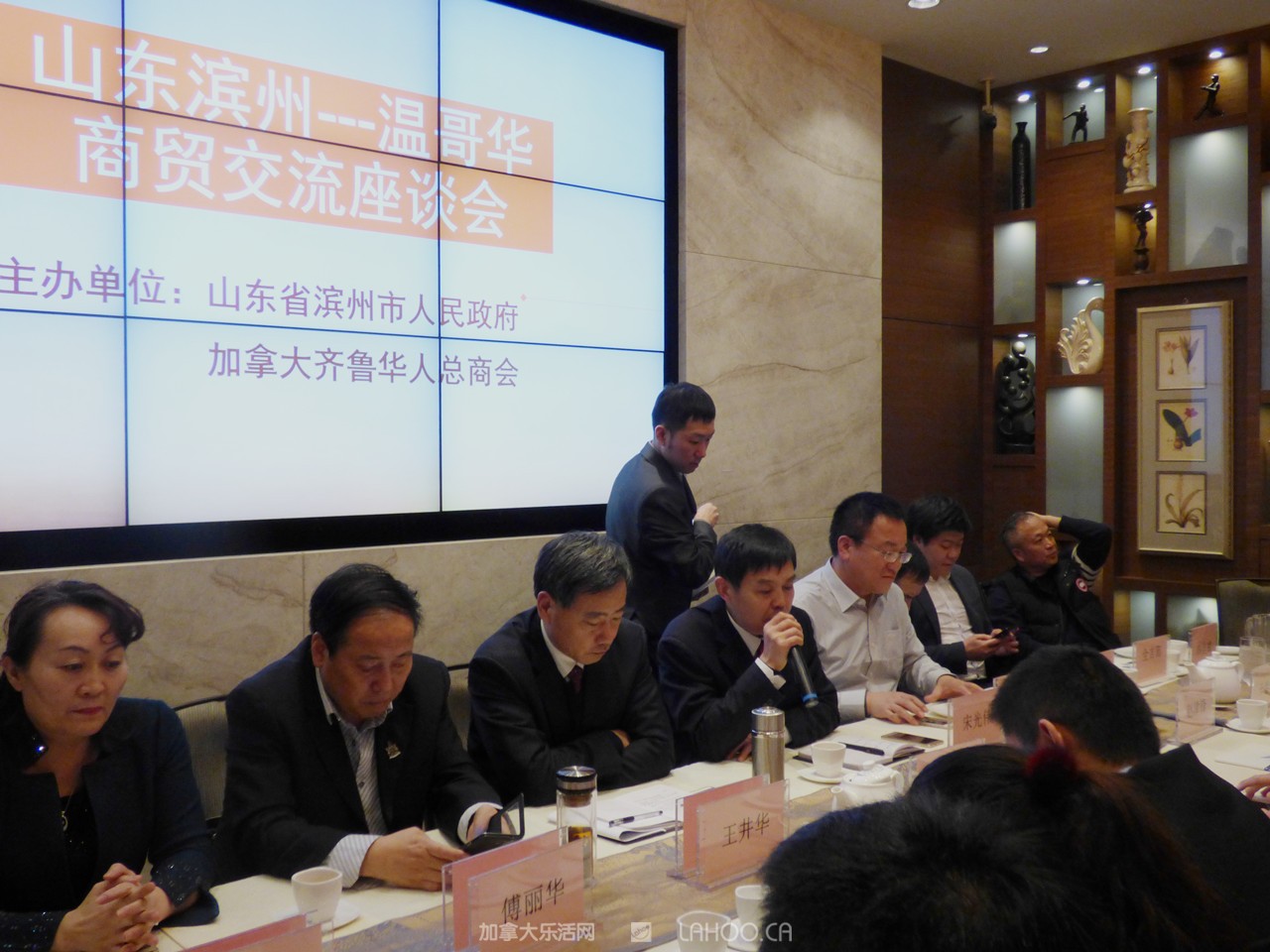 滨州市招商局副局长王德军先生介绍了全市的经济发展情况,热烈欢迎加拿大企业家回国创业,携手共进。特邀商界嘉宾和加拿大齐鲁华人总商会部分会员企业20多人分别就现代地产、海洋食品、家用纺织、文化合作、矿产资源、资本运作、新能源利用等多个领域展开了热烈讨论,就投资贸易项目做了深入地了解。