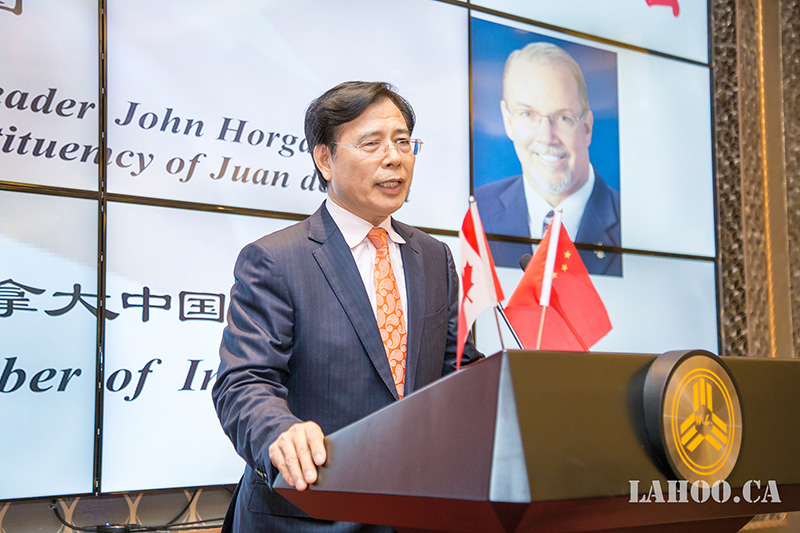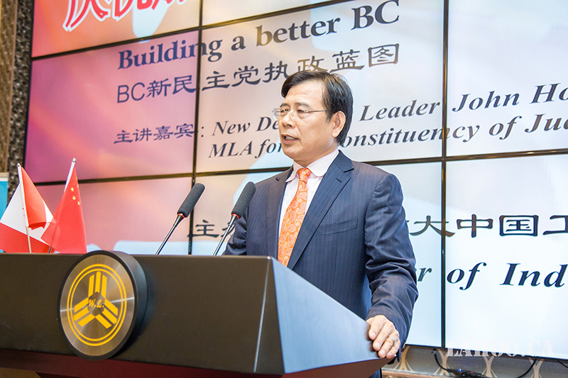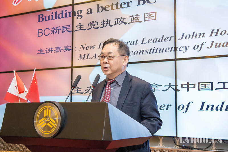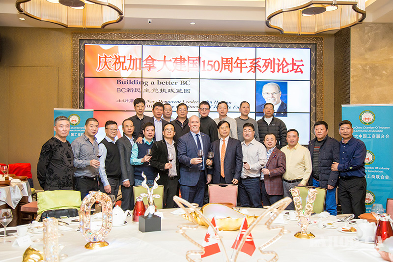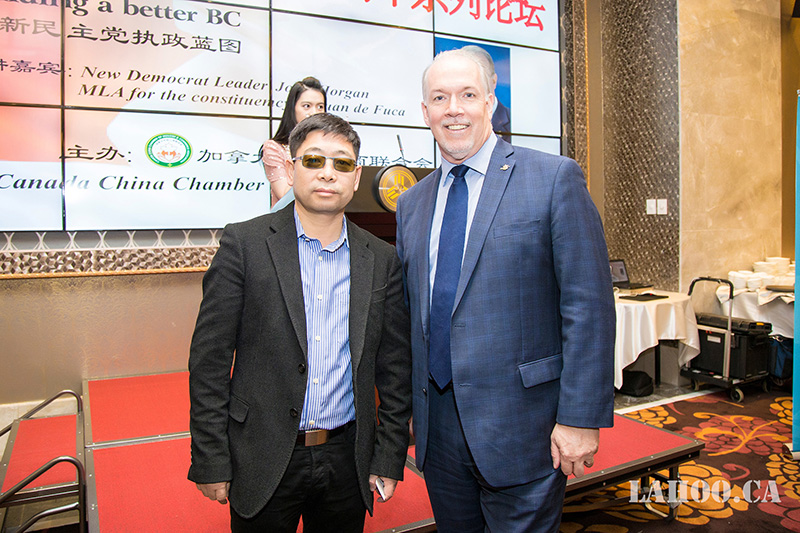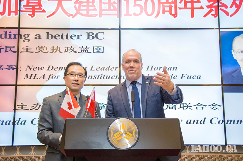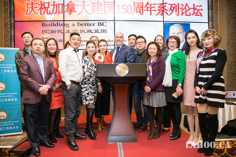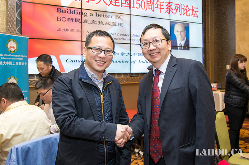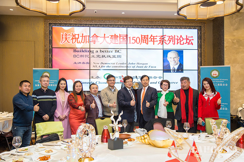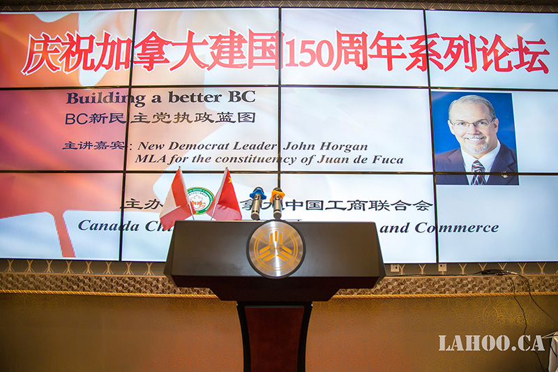 [加拿大乐活网 lahoo.ca 吴穹报道、乐斌摄影]2月28日由加拿大中国工商联合会主办的加拿大建国150周年系列论坛在温哥华半岛酒店隆重举办,由于卑诗省选已拉开序幕,为了让华裔社区更好地了解省自由党和省新民主党两党党领及两党政纲,能与华裔社团精英面对面晚餐讲座、沟通对话,主办方今天请到卑诗新民主党党领贺瑾先生(John Horgan)为嘉宾做《卑诗新民主党执政蓝图》的专题演讲,这样的演讲在加拿大华人社区历史上第一次,意义非凡。贺瑾先生的演讲涉及到新民主党在政治、经济、医疗、教育等多个方面的施政纲领及具体措施,现场提问环节更是事无巨细的解答嘉宾提出的问题。200余位大温地区社团侨领、商业精英及众多华人华侨参加本次论坛。加拿大乐活网及高度周刊全程报道本次活动。