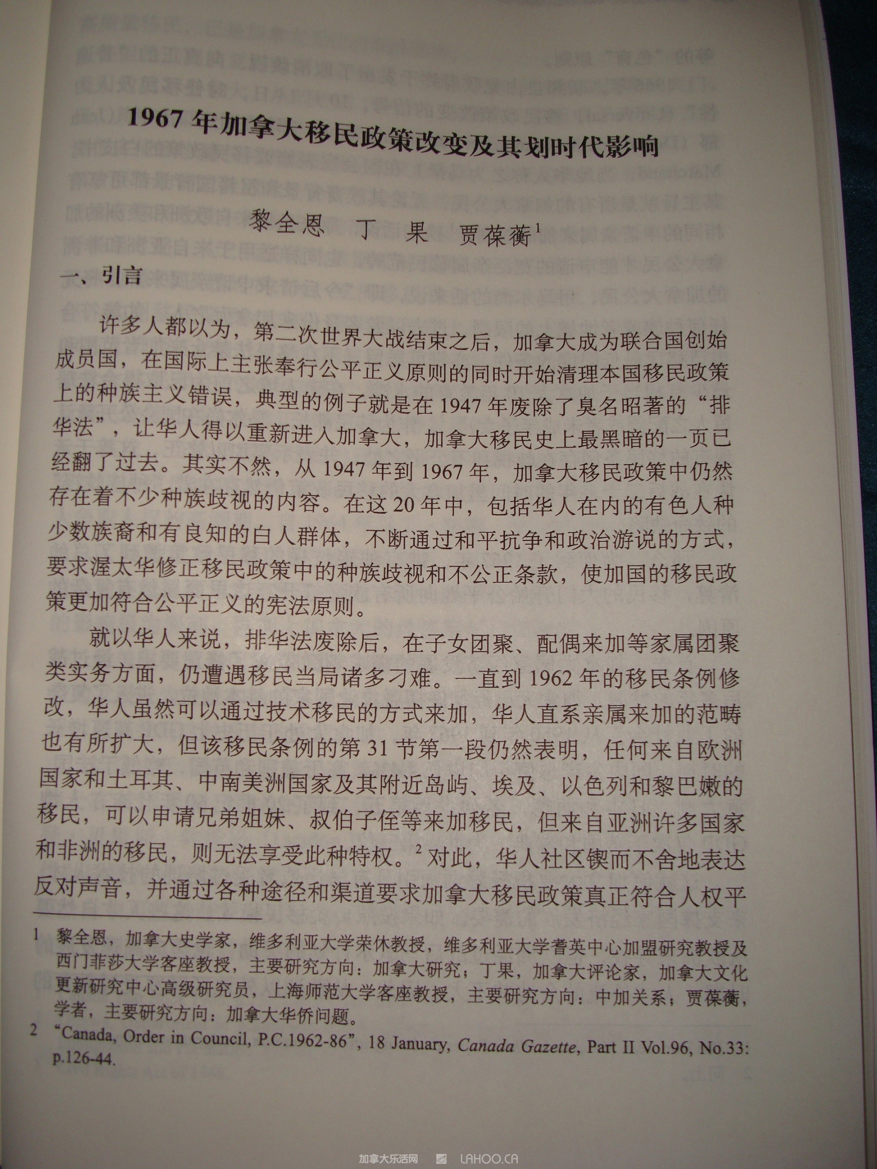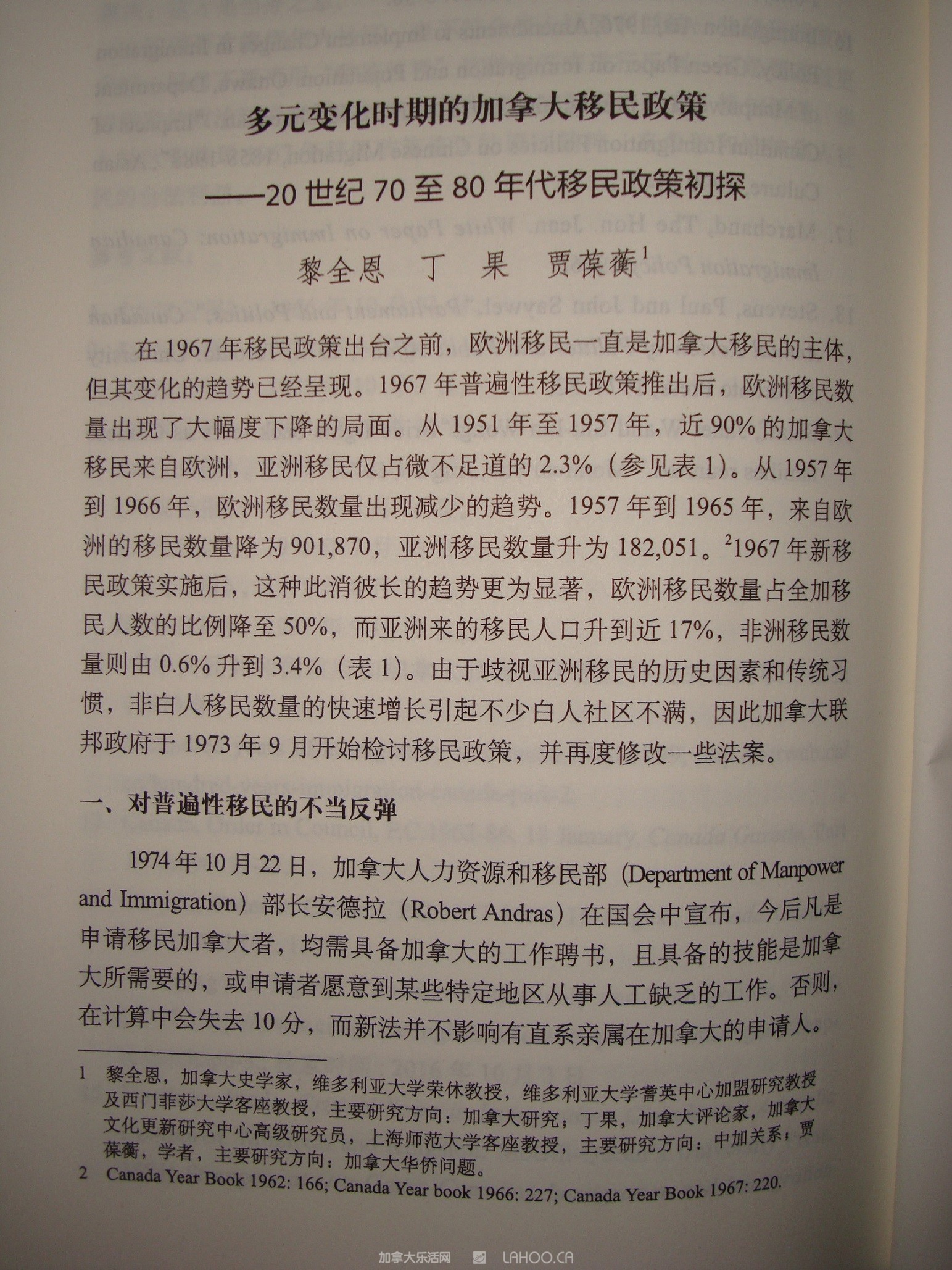 这本学术专著有关加拿大作者方面,收录了由加拿大著名史学家,加拿大勋章获得者,被称为“唐人街之父”的黎全恩教授、加拿大著名评论家丁果和加拿大华裔作家贾葆蘅三位学者共同撰写的两篇论文:1967年移民政策改变及其划时代影响和多元变化时期的加拿大移民政策。这两篇论文详实记载1967年至1989年之间加拿大联邦政府推出的一些列移民法案,并围绕不同时期移民政策加以具体论述。