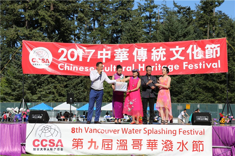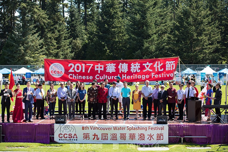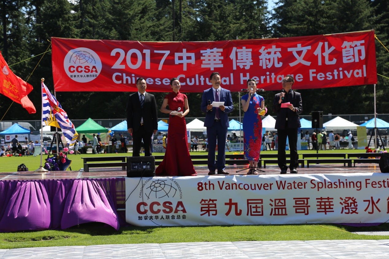 7月30日,早上11点由加拿大华人联合总会主办的“2017年中华传统文化节暨第九届温哥华泼水节”在本拿比中央公园的斯旺嘉德体育馆正式拉开帷幕。本次参加活动的嘉宾主要有:中国驻温哥华总领馆孔玮玮副总领事,侨务组组长郑轩领事,BC省儿童商务厅厅长 Katrina Chen,省议会副议长 Raj Chouhan,省议员 Anne Kang,省议员Janet Routledge ,本拿比代市长麦当劳先生,本拿比市议员王白进先生,中华会馆理事长姚崇英先生,中桥基金会主席杨兴琳先生,慈济代表温哥华国际中医学院校长何丽娜女士,加拿大华人社团联席会执行主席王典奇先生等,蒙特利尔华人社团代表杨宁会长,主办方加拿大华人联合总会出席的嘉宾有:创会会长普翔先生,执行主席牛华先生,副会长吴卫、许家勋、朱水兴,副秘书长Sheena 沈、朱晋华、姜波秘书,常务理事许静、王岩、彭兰媚,理事刘海、蒋浩、徐作春、薛海青、Winnie 陈、薛宇锋、顾军刚、谷泉、郑燕、林志山、孙航,还有全场最重要的人士——本届文化节总导演:刘逖女士。