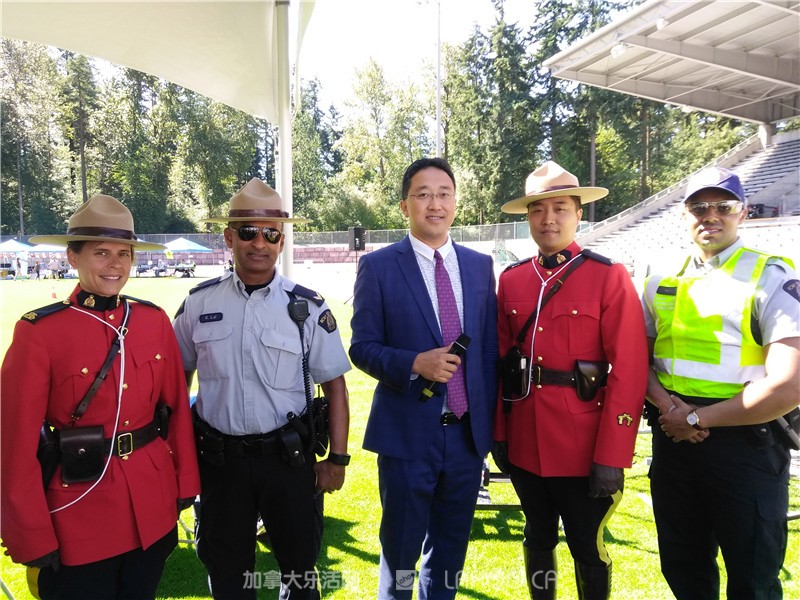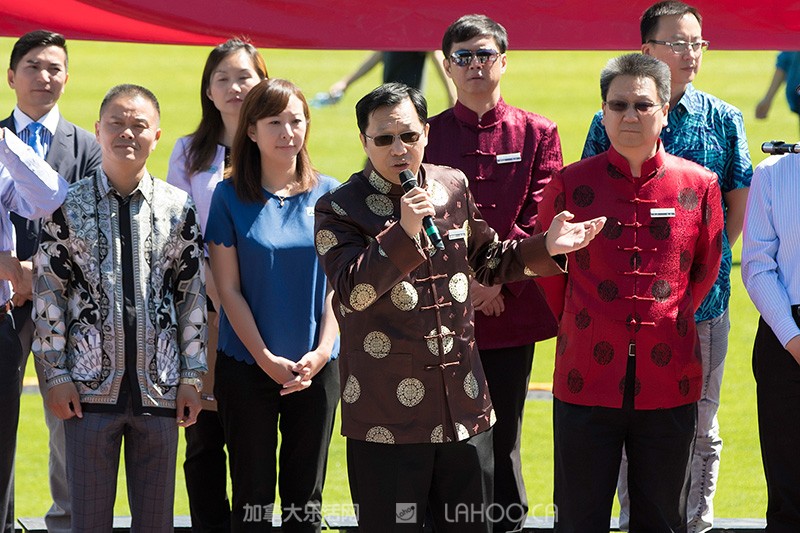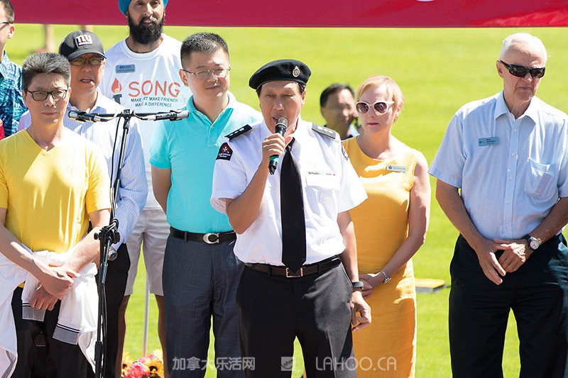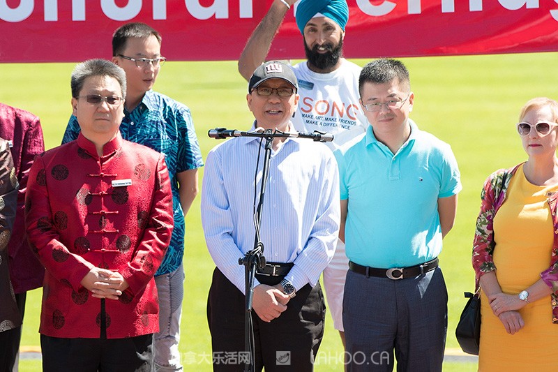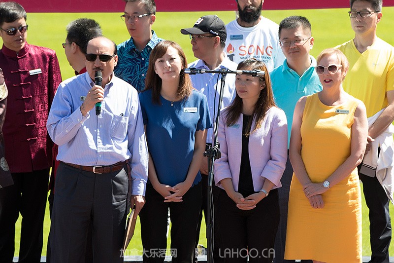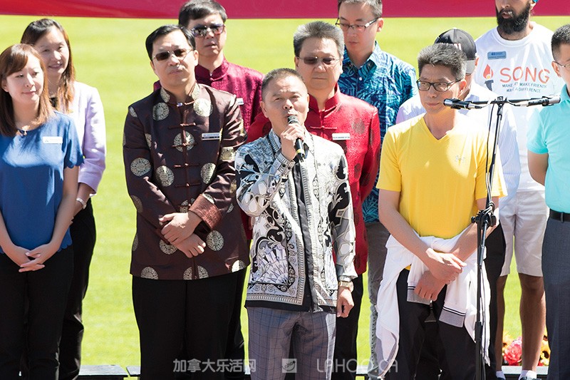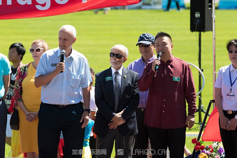 方阵完成后,主持人介绍到场嘉宾并邀请众嘉宾上台。首先邀请了本拿比代市长麦当劳先生做开场演讲,他表示,非常荣幸,大家前来本拿比举办这么有意义的活动,希望大家能透过这些活动加深相互的了解。