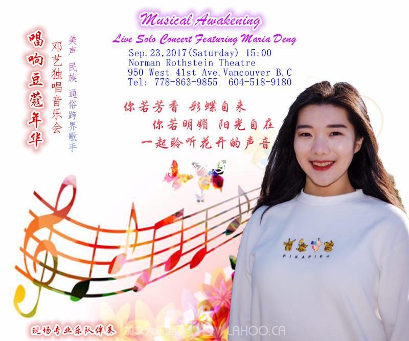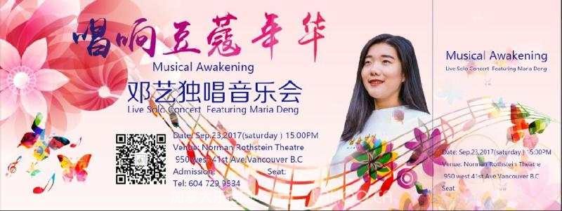 [作者:卫静 ]2017年9月23日下午3点, 17岁华裔歌手邓艺(Maria)将在温哥华举办自己的个人演唱会,并且跨界演唱美声、民族和通俗歌曲。这是邓艺的首场音乐会,比起母亲-著名歌唱家马继雯的个人独唱音乐会整整提前了7年。