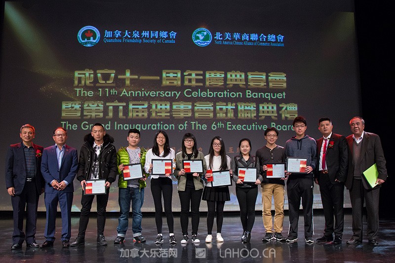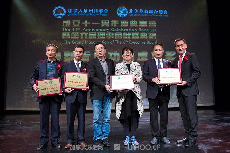 加拿大联邦国会议员关慧贞女士、中国驻温哥华总领事馆田妮副总领事、泉州市人大常委会副主任曾巍、泉州市海外交流协会常务副会长李卫平共同为两会终身成就奖得主颁奖,获奖者是:永远名誉会长庄少卿、永远名誉会长许健伦、永远名誉会长黄国华、两会会长苏亚帅