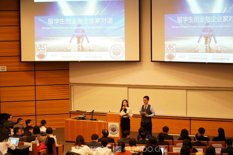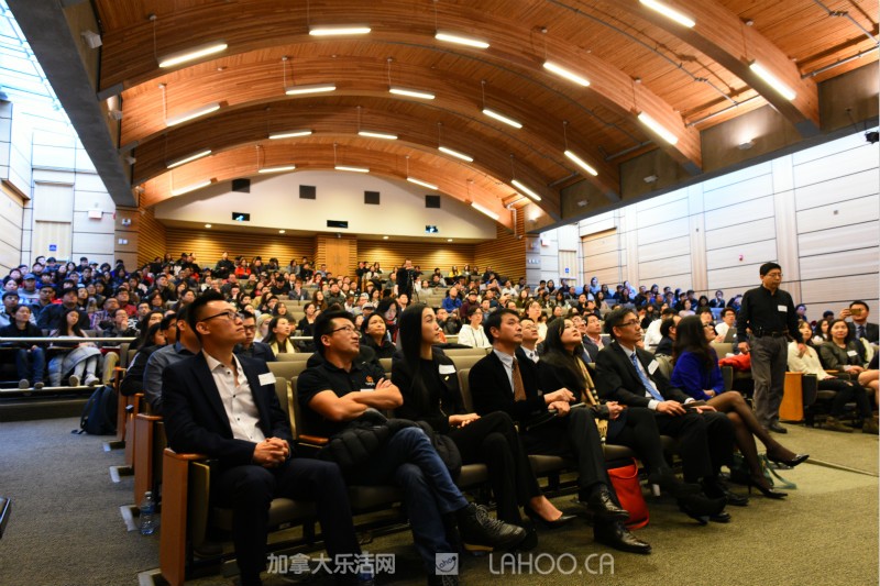 【加拿大乐活网(lahoo.ca)记者胡家骏报道,英涛、Davie Yuan、Liu Jun摄影】2018年1月14日下午2时,冬日的阳光不期而至。在UBC校园内2260 West Mall里,由UBC与加拿大灰熊研究院联合举办的“留学生创业与企业家对话”活动,热烈而有序地进行。十几位企业家来到活动现场,与400余位留学生分享了自己的创业故事和职业感悟。活动由UBC两位学生张译元,李卓恒主持,UBC校长中国事务高级顾问、加拿大阿尔茨海默症首席研究员、医学院精神病学系教授宋伟宏,中国驻温哥华总领事馆教育领事于长学,加拿大灰熊研究院院长、UBC林学院副院长、亚州林业研究中心主任王光玉先后发表致辞。