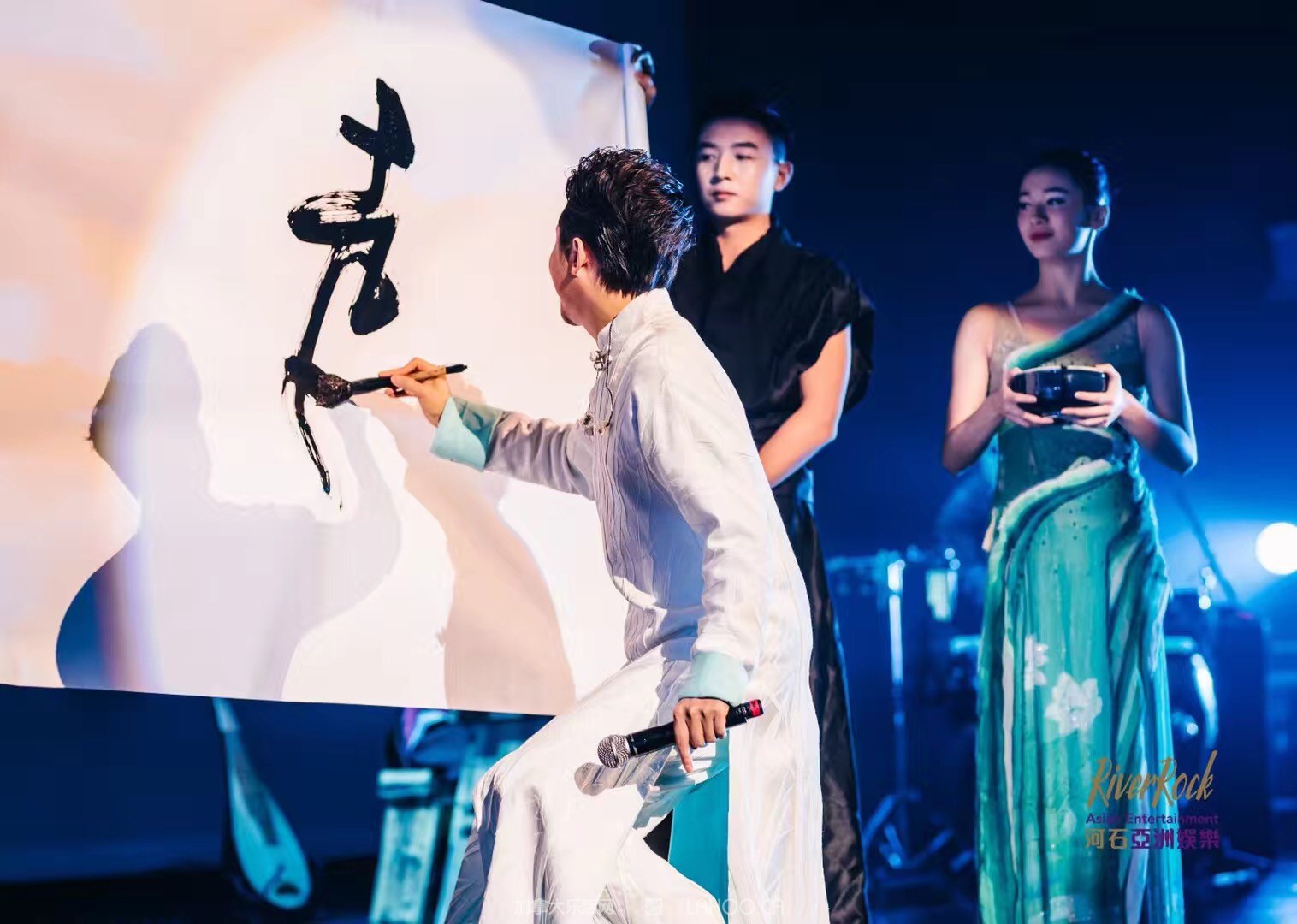 李玉刚现场书法,写下“赵钱孙李”四个大字,以示全球华人血脉相承的美好关系。