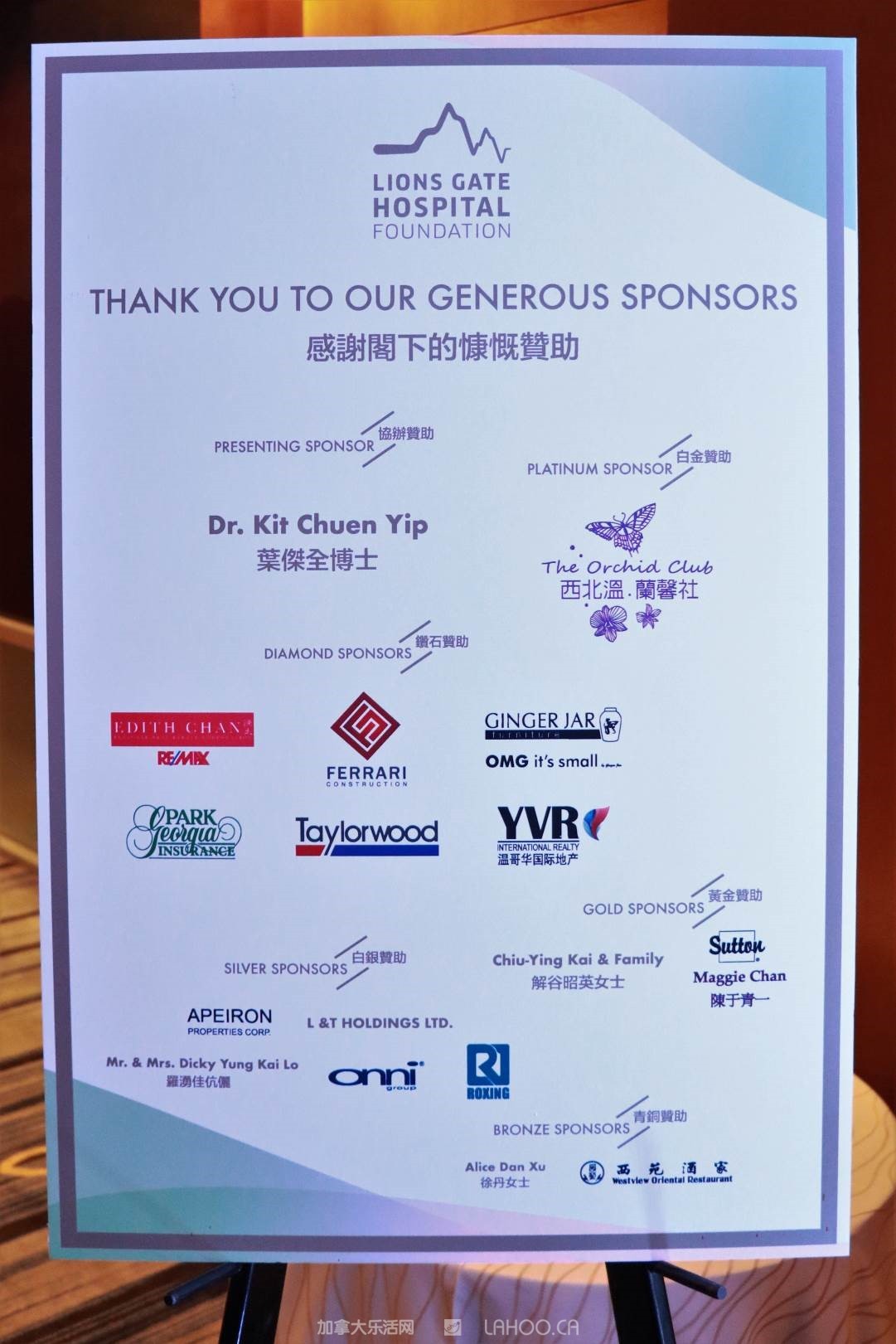 本届活动主要赞助商:首席协力赞助:叶杰全博士,白金赞助:西北温兰馨社。钻石赞助:Edith Chan,Ferrari Construction, Park Georgia Insurance, Ginger Jar Furniture, Taylorwood Investment, 和 YVR International Realty。黄金赞助:Chui-Ying Kai & Family解谷昭英女士阖家和Maggie Chan陈于青一。白银赞助:Aperiron Properties Corp., L&T Holdings, Mr & Mrs Dicky Yung Kai Lo罗涌佳伉俪,Onni Group和Roxing Enterprise Inc.。娱乐赞助:Mr. Brian Hui许耀光先生。青铜赞助:Ms. Alice Dan Xu徐丹女士和Westview Oriental Restaurant。媒体赞助:加拿大乐活网Lahoo.ca。