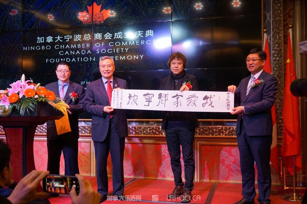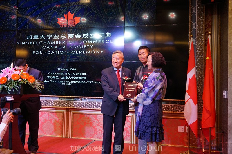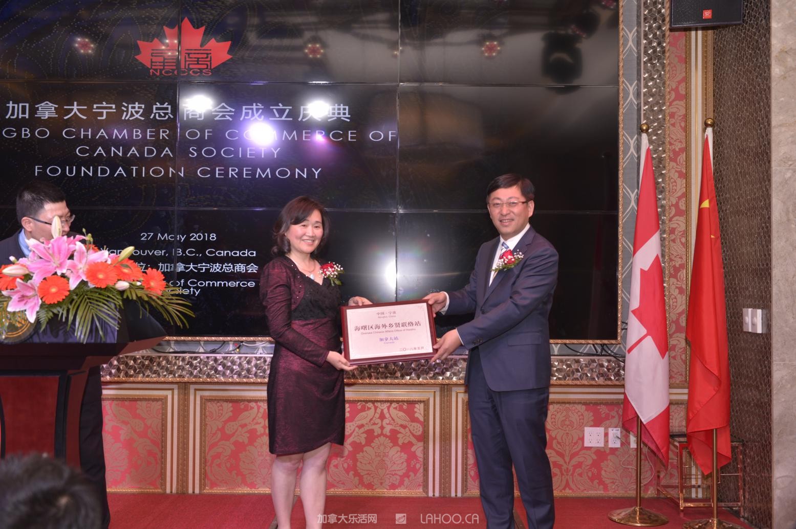 宁波市人民政府侨办主任顾正为先生为宁波市海外交流协会加拿大温哥华分会揭牌 由总商会副会长张伟龙先生代领受牌