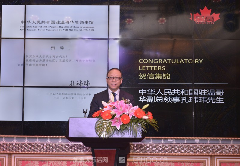 成立仪式上,中华人民共和国驻温哥华总领馆、BC省长贺瑾、国会议员朱理民、BC省议员屈洁冰、Katrina Chen、宁波市人民政府侨务办公室、宁波市归国华侨联合会、宁波侨商会、甬商总会、加拿大中华商会、河北商会、加拿大浙江大学校友会以及澳大利亚、泰国、罗马尼亚、新西兰、新加坡等国家的宁波商会和同乡会纷纷发来了贺电、贺信。