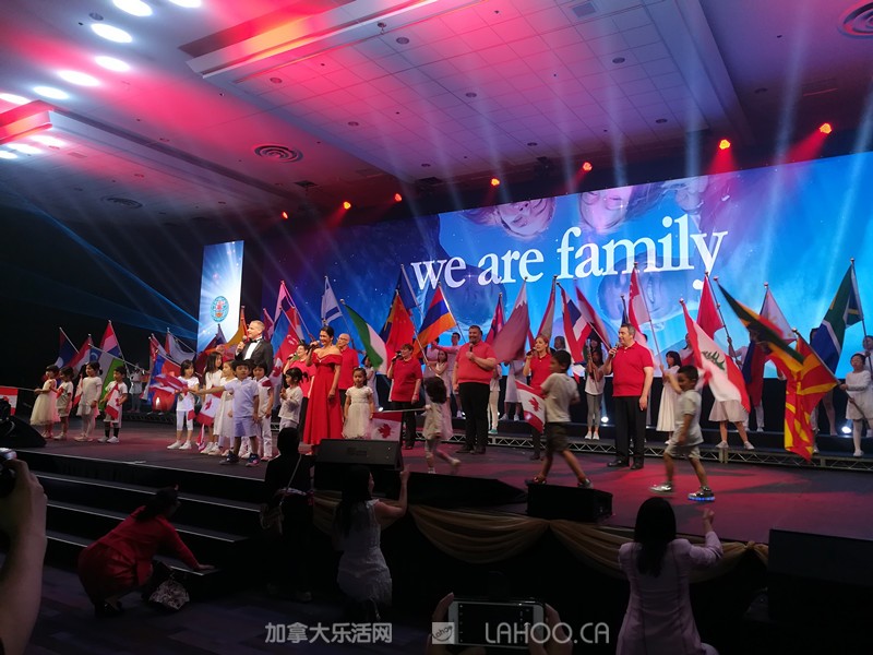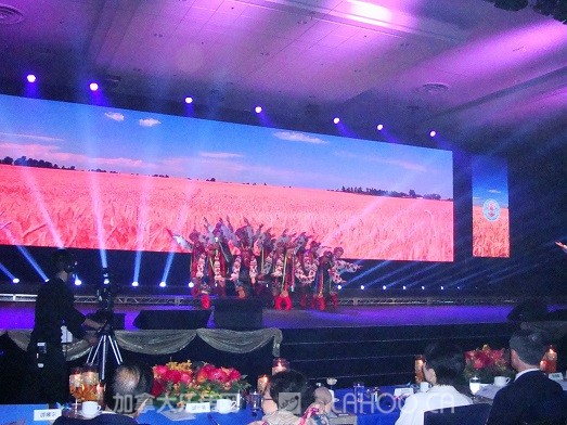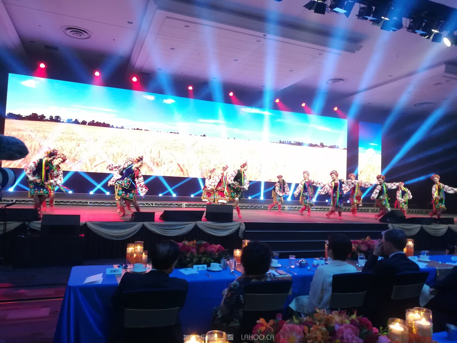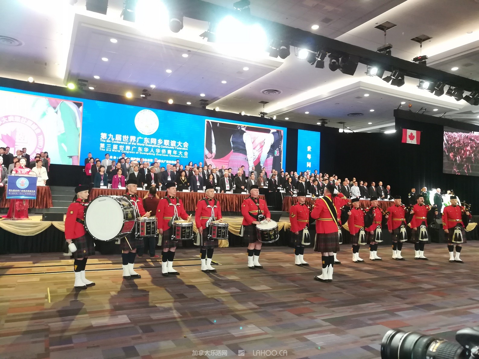 嘉宾就座后,在皇家骑警护卫队和仪仗队引领下,升中加两国国旗、“世粤联会”会旗和加拿大广东社团总会会旗。之后,原住民跳起欢快的舞蹈。