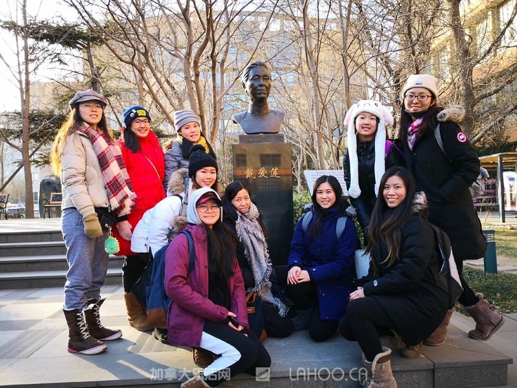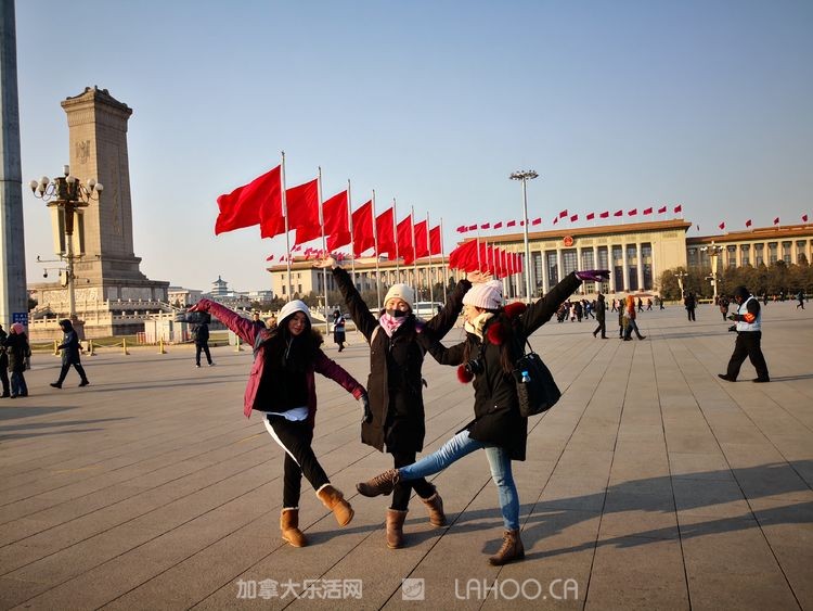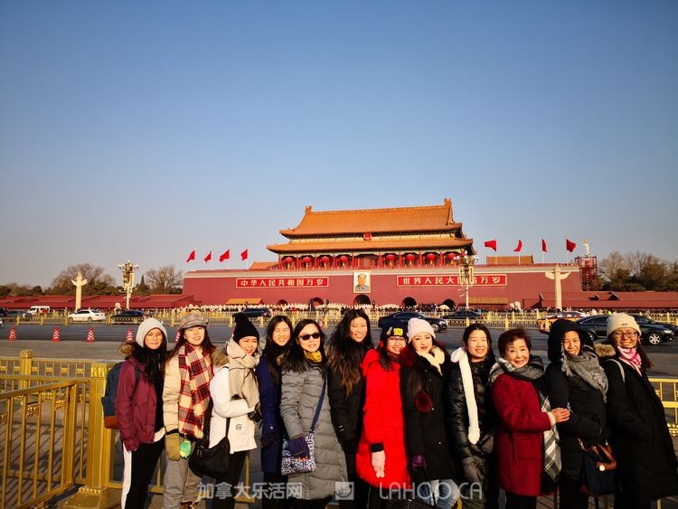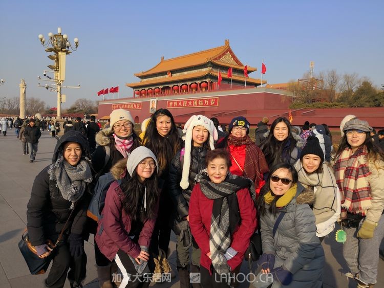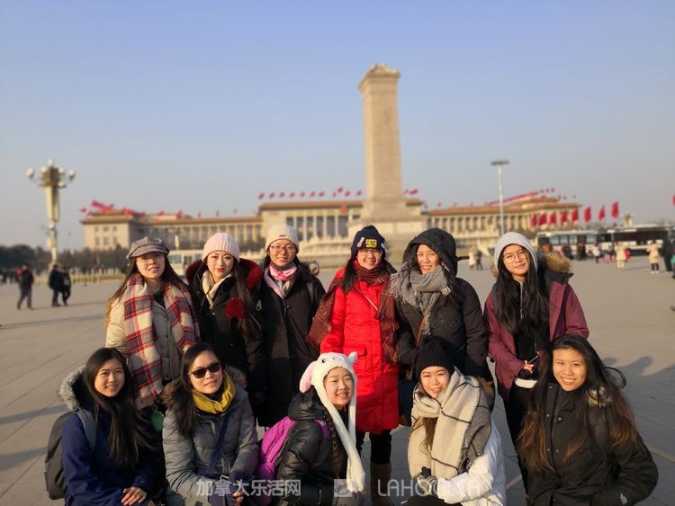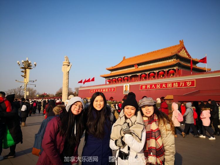 1月北京的早晨虽然寒风凛冽,但却晴空万里,阳光明媚,天安门以蔚蓝的天空迎接这群海外游子的到来。师生们怀着崇敬的心情参观了天安门广场和广场上高耸的革命烈士纪念碑。后来采访时,陈玲老师动情地说,当看到雄伟的天安门庄严肃穆地矗立在那里,看到开国领袖画像挂在那里,心里有一种说不出的感动。她向学生们介绍了北京及天安门对于中国人的意义。很多学生是第一次走进天安门广场,第一次站到开国领袖画像前,大家的心情都很激动,每个人都在那里拍照留念。