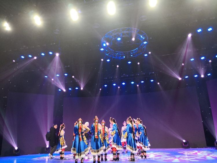 12月31号,是正式录制新春联欢晚会的日子。学生们早早起来化妆,有条不紊地为演出做好准备后,很早就来到星光影视圈录制基地。正是因为她们平时就怀着追求高水平演出水准的信念刻苦排练,所以正式拍摄时进行得非常顺利。陈玲舞蹈学院精心排练的藏族舞蹈《扎西德勒》布景辽阔,气势宏大,音乐韵律激越,节奏感强烈,极富藏民族音乐特色。姑娘们献出全部的热情和最佳的精神状态,全力以赴,热情洋溢的舞姿,完美地演绎了藏族姑娘在草原上跃马驰骋的热情奔放及热爱生活的欢快心情,博得在场嘉宾的热烈鼓掌。