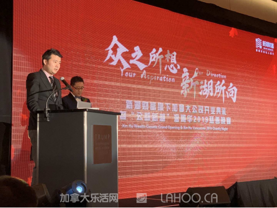 中华人民共和国温哥华总领事馆商务领事余旭先生对新湖加拿大的开业致以了美好的祝愿,他对新湖财富开业典礼和慈善晚宴的表示热烈的祝贺。余旭领事致辞说:新若如鼎,湖广则盈。新湖财富可以说是伴随着我国改革开放40周年的进程而成长起来的,也见证了中国改革开放的历史和成就。祝新湖财富在这温哥华越办越好,越办越红火,祝福新湖也能够积极的回馈我们本地的社区create more jobs, create more taxes,尽量履行自己的社会责任。