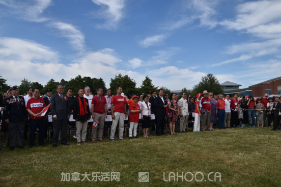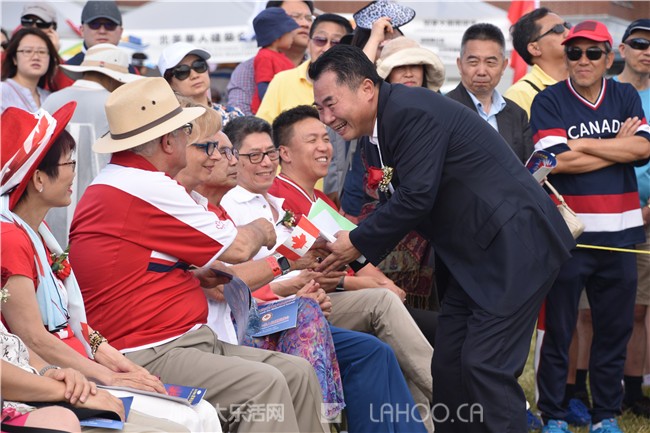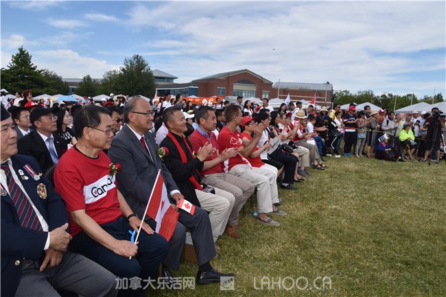 中国驻温哥华总领事佟晓玲、副总领事王承军、胡启全处长、王进、丁天领事登台祝贺大家国庆节快乐!佟总领事讲话说她今天非常高兴地看到我们场的华裔同胞们,笑容满面、和谐包容地与多族裔的居民们共庆今年的加拿大国庆。 希望华裔同胞们能为繁荣加拿大多元文化、弘扬中华文化,共同建设好多族裔共同的加拿大作出应有的贡献!