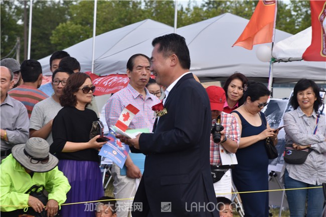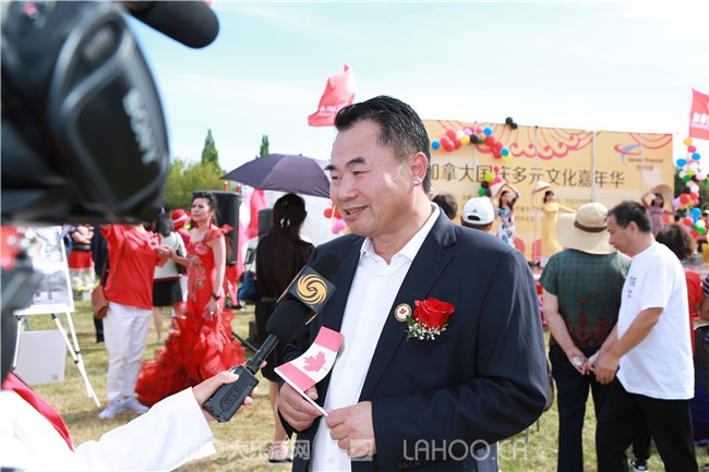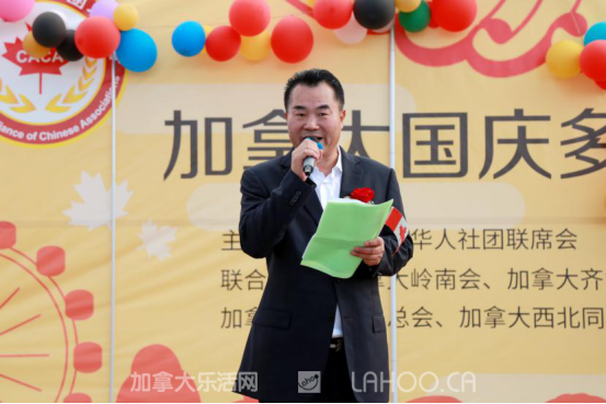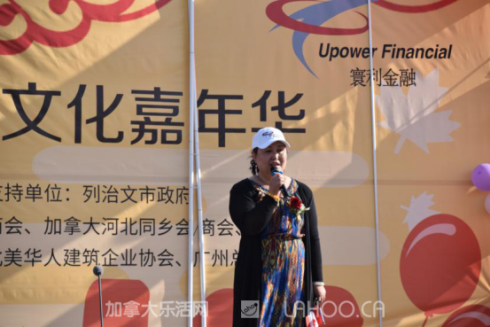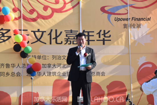 冠名赞助商加拿大寰利金融的代表钱华讲话,表达他们全力支持这一活动,就是支持多元族裔同庆同乐,很有意义。