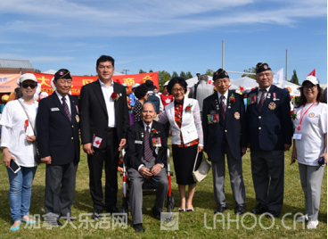 华裔退伍军人代表登台,会长邝杰雄讲了话,表达了他们八位95-99岁的退伍老兵的爱国情怀。