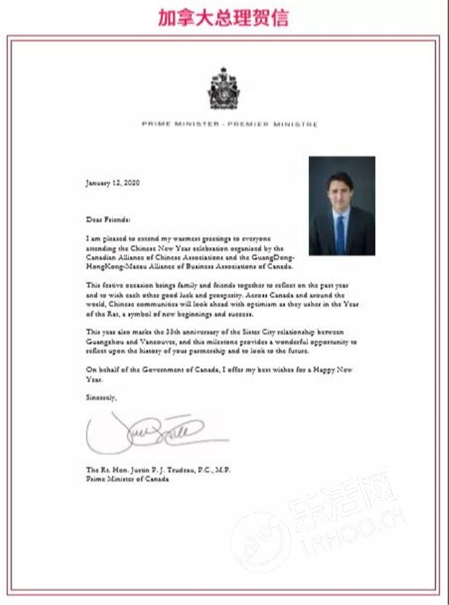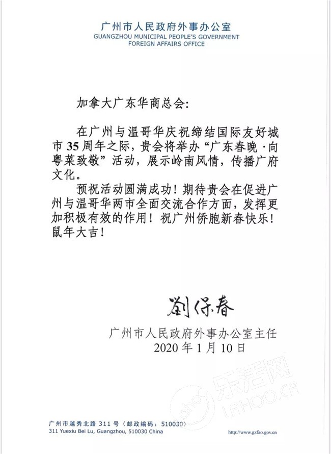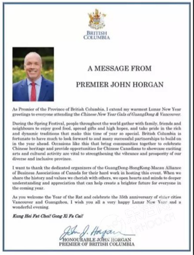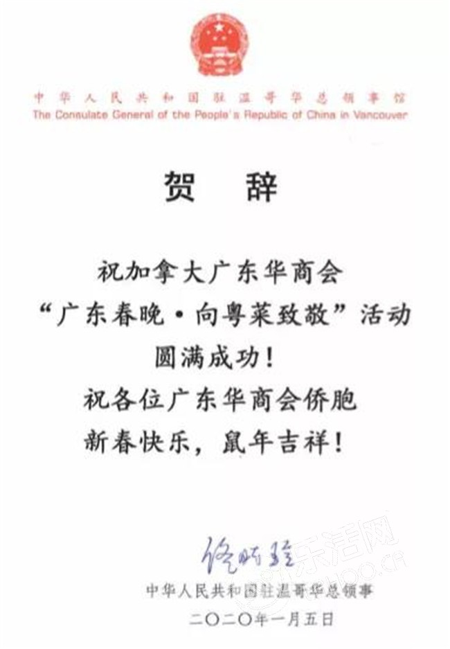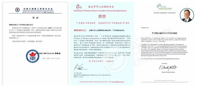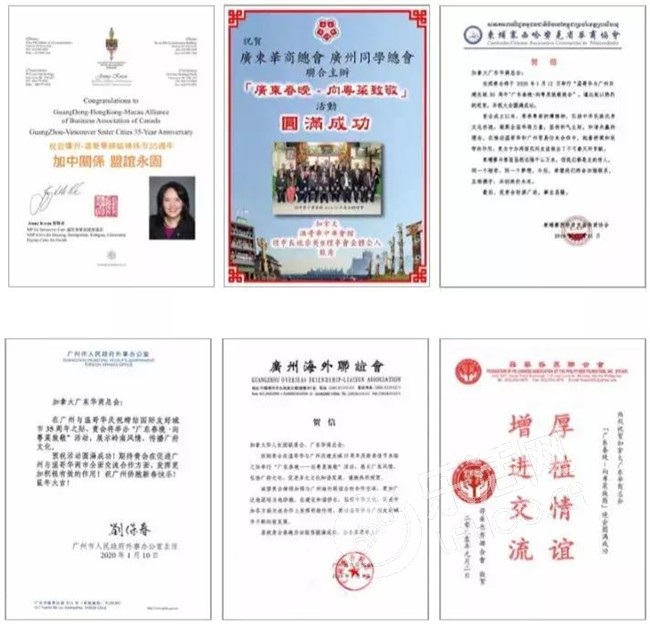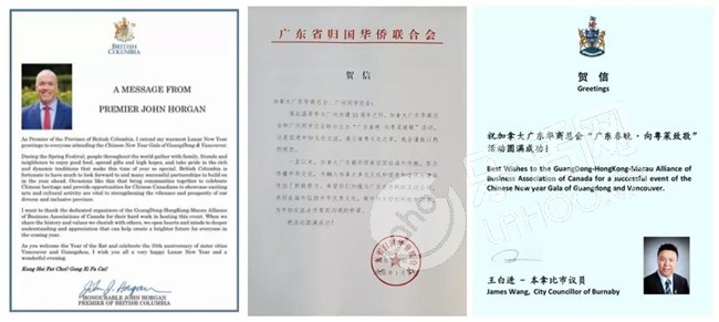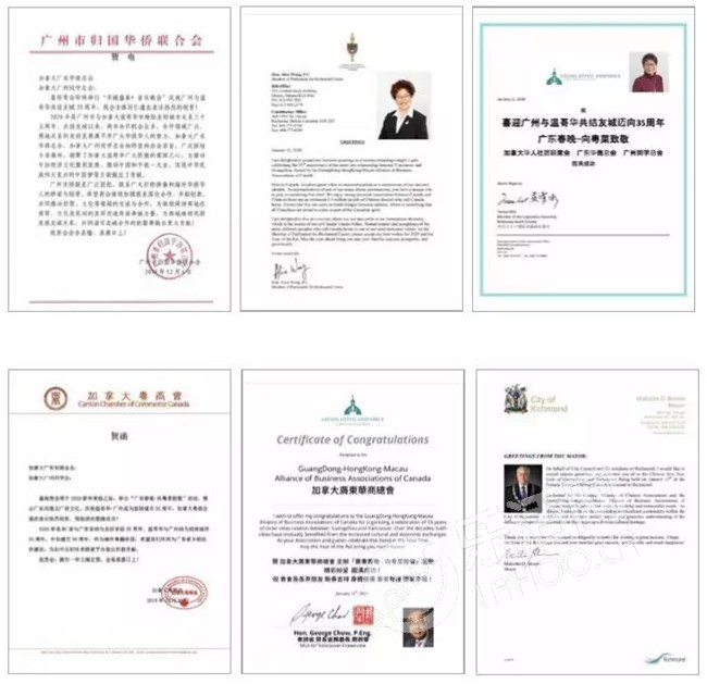 由加拿大广东华商总会主办的广东春晚活动,为促进中加文化交流,加拿大总理杜鲁多、中华人民共和国总领馆、加拿大BC省省长、广州市人民政府外事办、广东省侨联、广州市侨联等中加政府机构及友好社团,发来贺电。感谢您对广东华商总会的支持!