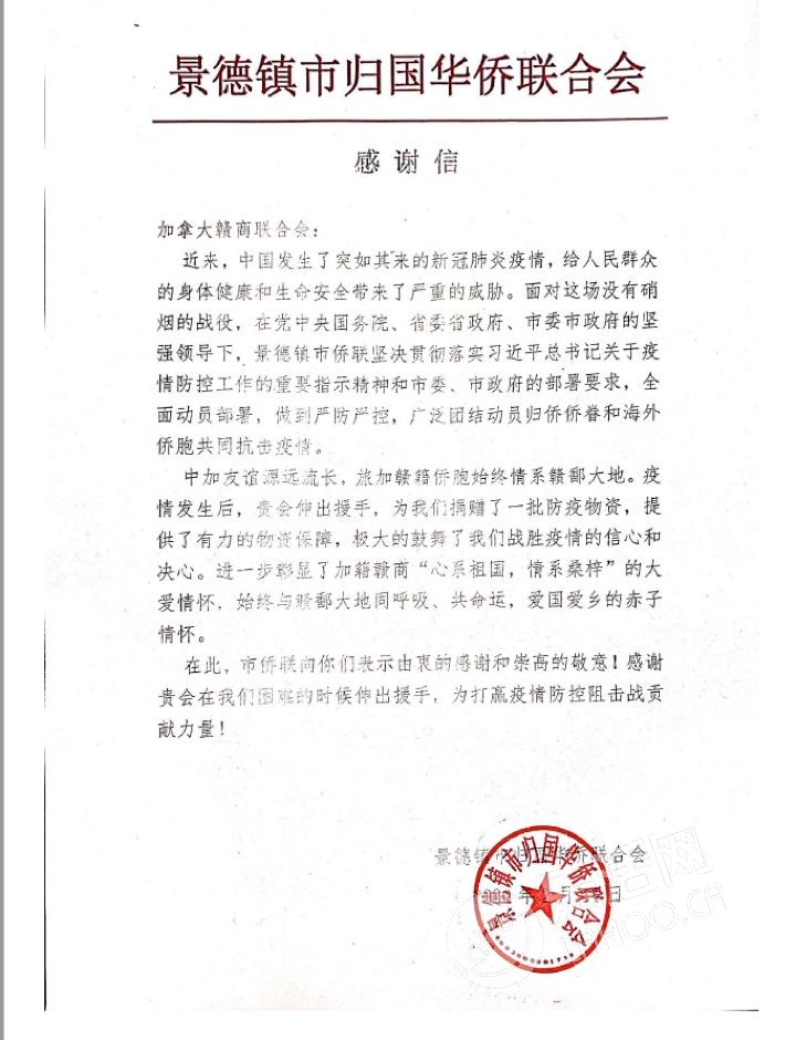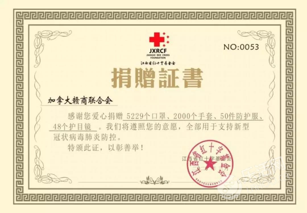 加拿大赣商联合会荣誉会长胡清华个人捐款2万元,由北京新余企业商会统一捐给江西新余市红十字会,用于家乡抗疫救灾。