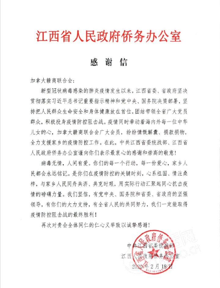加拿大赣商联合会衷心希望,赣商会集全体成员的一点微薄力量和爱心,能够助力奋战在江西疫情灾区的第一线的医务工作者,能够更好的保障安全,救治病患!同时也由衷的感谢,在爱心捐赠过程中真诚付出,积极参与,出人出力的每一位爱心人士,涓涓细流,大爱无疆!