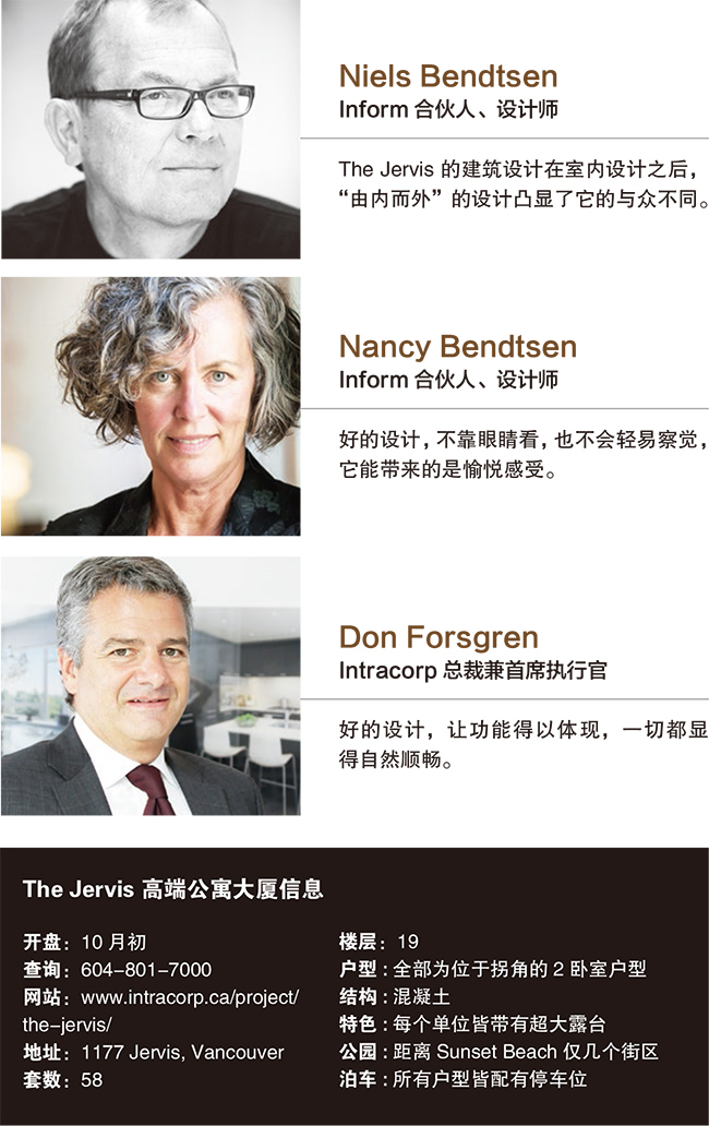 相信不论是热爱设计还是注重地段,亦或是注重生活品质的人们都不会忍心错过 The Jervis。说到 The Jervis 的买家,Forsgren 认为钟情设计崇尚艺术的人士将占绝大部分。当然,其中将不乏在温哥华居住很久、与 West End 颇有渊源的人们,他们或是曾在此工作,在此有了家庭,在搬离此地后想重拾在海滩漫步、在 Stanley Park 度过闲暇时光的日子;也不乏上班族,他们向往步行去Downtown上班,在阳光撒过路面的清晨,穿梭在街道两旁的林荫中,省去的是路途奔波,得到的是方便的生活。