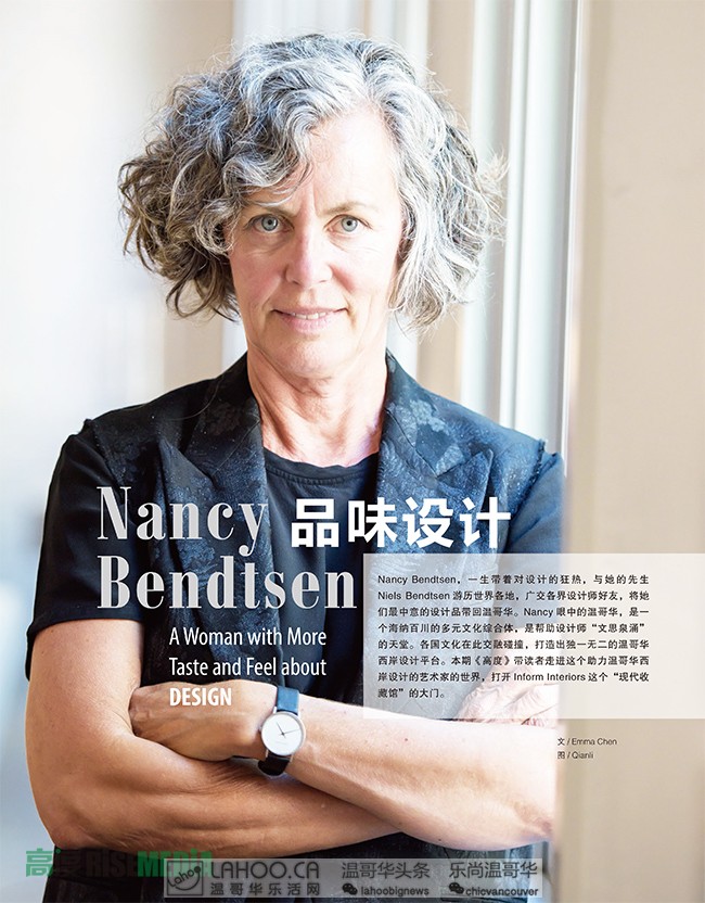毕 业于多伦多大学建筑系的Nancy Bendtsen 是温哥华本土兼顾室内设计,室内家居零售的著名品 牌 Inform Interiors 的 老 板, 温