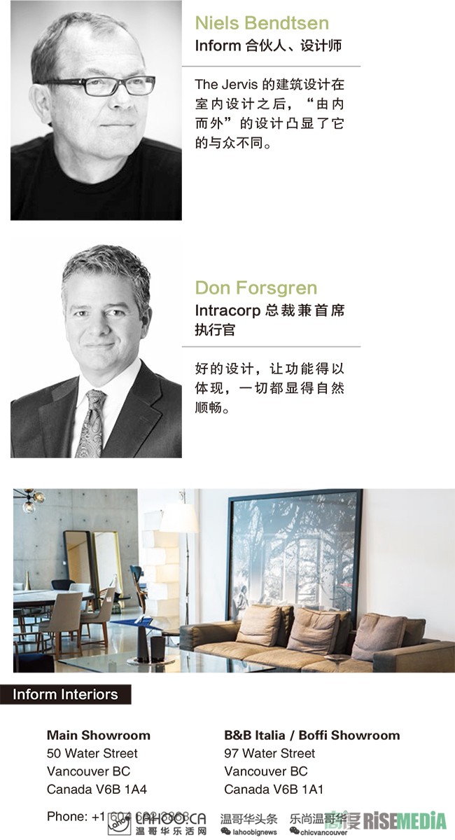 哥华规模最大的 IDSwest(温哥华室内家居设计展)的形象大使之一。Inform Interiors 是温哥华各大地产商争相合作的本土设计公司,也是唯一参加过建筑楼外观设计的温哥华室内设计公司。