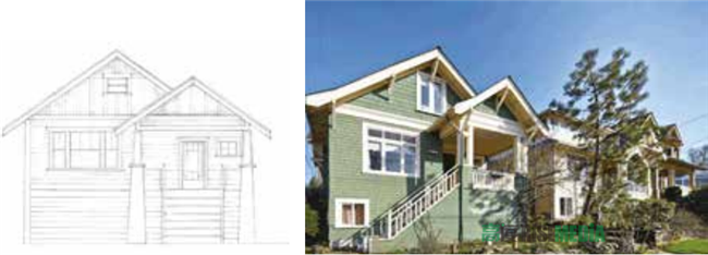 从外观上看,温哥华特色屋就显得“特色十足”,非常好认。它造型简单,地上两层,(长)方形盒状结构,屋顶坡度很小,正面二层有室外阳台,一层外墙贴红砖或石板,二层为灰泥抹就。