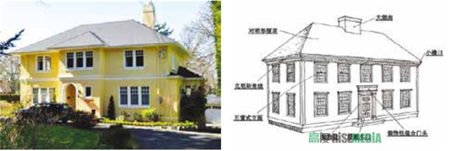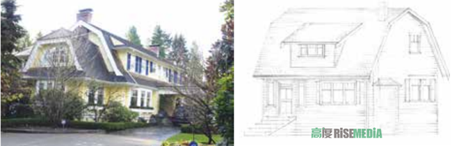 双折线屋顶,侧墙开老虎窗,这些是荷兰复兴式建筑最显著的特点。另外,此类房屋基本呈非对称格局,屋顶开巨大的辛格窗。
