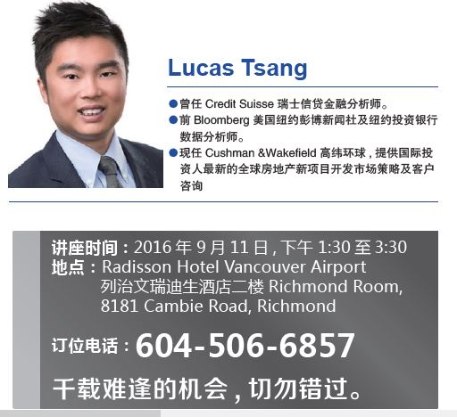 CUSHMAN & WAKEFIELD 高纬环球Multifamily Advisory Group, Lucas Tsang 获 Cachet Capital LP邀请,前来温哥华举办唯一一场讲座, 从国际投资金融和全球房地产开发的眼光,为您详解世界热钱的走向、美国经济和全球关系、美金的趋势;如何善用到位的资金,准确精准投资.