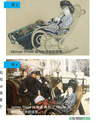 或许是为了迎合市场需求,工匠们紧接着推出了婴儿摇椅、儿童摇椅和青少年摇椅。在寻求舒适感的同时,摇椅也成为创作者手中的一件件艺术品。制造工匠Michael Thonet使用蒸汽将藤条弯出不同弧度,用圆弧取代了之前四条腿的支撑结构,流线型的椅身使整个摇椅显得十分圆融大气。(图3)