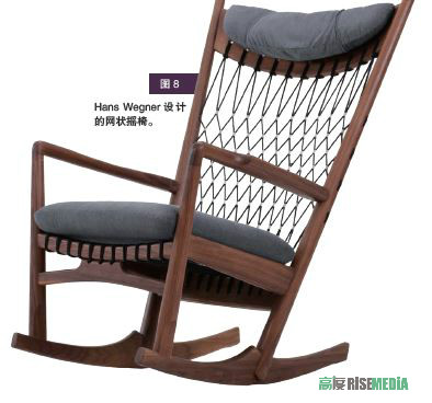 丹麦建筑大师Hans Wegner在他的职业生涯早期,曾设计过一种椅背为多根细长直棂、椅座为网状结构的摇椅,之后他还发布了一个更大胆的版本,就是把摇椅的椅背和椅座全部变为绳网。另一名丹麦设计师Ole Wanscher,设计出一款木质框架的软垫摇椅,成为摇椅设计界的经典款。(图8)