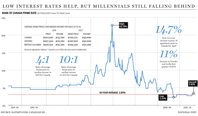 金融邮报(Financial Post)的报道说,这位教授用了房价/工资之比来分析千禧一代(25-34岁年龄组)与他们父母一代的差别:在上世纪70年代,比如说1976年,婴儿潮一代也正处于现在千禧一代的年龄段,那个时候经通胀调整之后的平均房价为$213,030,全职工作年轻人的中位数收入是$54,700,因此房价与收入的比率大致为:4:1。