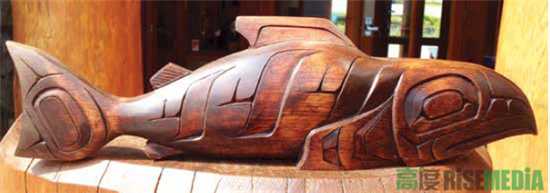 曾经有个传说,讲的是在古代,熊曾经抓去过族长的女儿,并和她结婚生育了两头幼熊,故而母熊还有养育之恩的意思。而三文鱼更代表繁殖能力强、无畏、重生等重要品质,所以熊和三文鱼在艺术作品中的结合既是来源于自然,也是衍伸于文化,是原住民信仰和精神的最朴实体现。