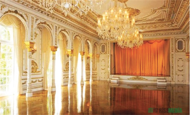 庄园内部的装潢奢华至极,入口处宏伟大气,两侧贴满15世纪时期的瓷砖,高彩绘天花板,金质灯具镶嵌多彩宝石,客厅镶有金箔,餐厅里装饰有名贵壁画。大型会议室、私人密室以及大型室外公共场所,整个布局与设计堪称完美。
