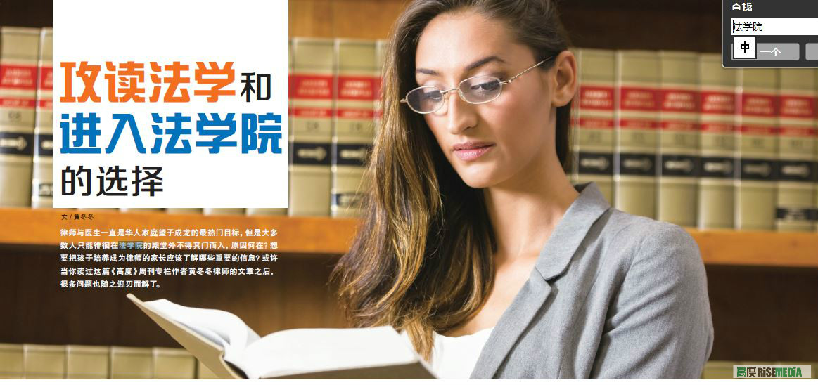 律师与医生一直是华人家庭望子成龙的最热门目标,但是大多数人只能徘徊在法学院的殿堂外不得其门而入,原因何在?想要把孩子培养成为律师的家长应该了解哪些重要的信息?或许当你读过这篇《高度》周刊专栏作者黄冬冬律师的文章之后, 很多问题也随之迎刃而解了。