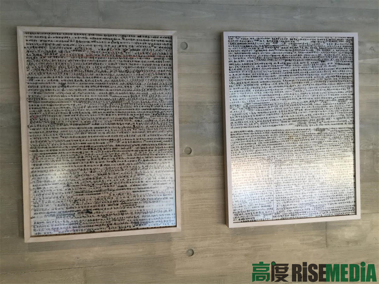 上述这种立意,尤其表现在对木心狱中手稿的处理上。一介两袖清风的书生,依然难逃残酷的政治迫害,从事文艺成了犯忌之举,竟然数度遭遇囚禁。被关押期间木心谎称“写检讨”,要来纸笔暗中创作。为尽可能充分利用纸张,字体极小,笔划潦草。最终得以偷运出来,不少字体就连木心本人都认不出来了。但这“狱中札记”非常宝贵,是那个时代的写照,如今被影印放大,装裱后如画轴般悬挂于壁,本身竟成为一具“艺术品”。
