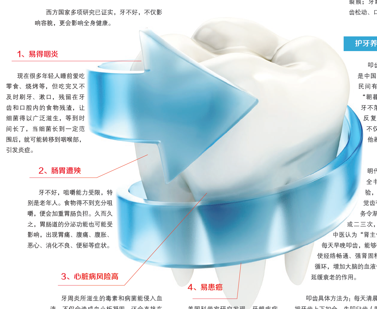 叩齿,也就是“叩天钟”,是中国古代盛行的一种养生术。民间有谚语形容叩齿的功效:“朝暮叩齿三百六,七老八十牙不落”。每天早晨上下牙齿反复相互咬叩60——360次,不仅能强健牙齿,对身体其他器官也是很好的锻炼。