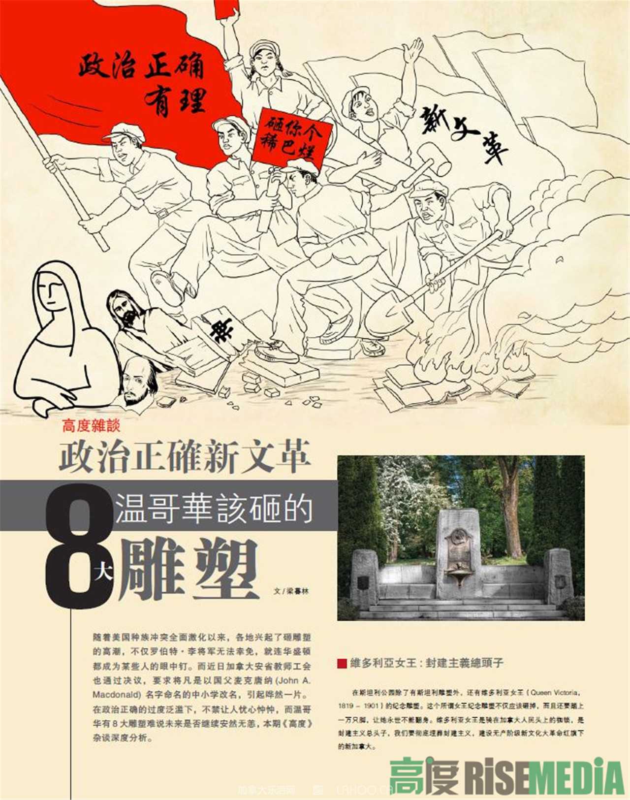随着美国种族冲突全面激化以来,各地兴起了砸雕塑的高潮,不仅罗伯特•李将军无法幸免,就连华盛顿都成为某些人的眼中钉。而近日加拿大安省教师工会也通过决议,要求将凡是以国父麦克唐纳(John A. Macdonald) 名字命名的中小学改名,引起哗然一片。在政治正确的过度泛滥下,不禁让人忧心忡忡,而温哥华有8大雕塑难说未来是否继续安然无恙,本期《高度》杂谈深度分析。
