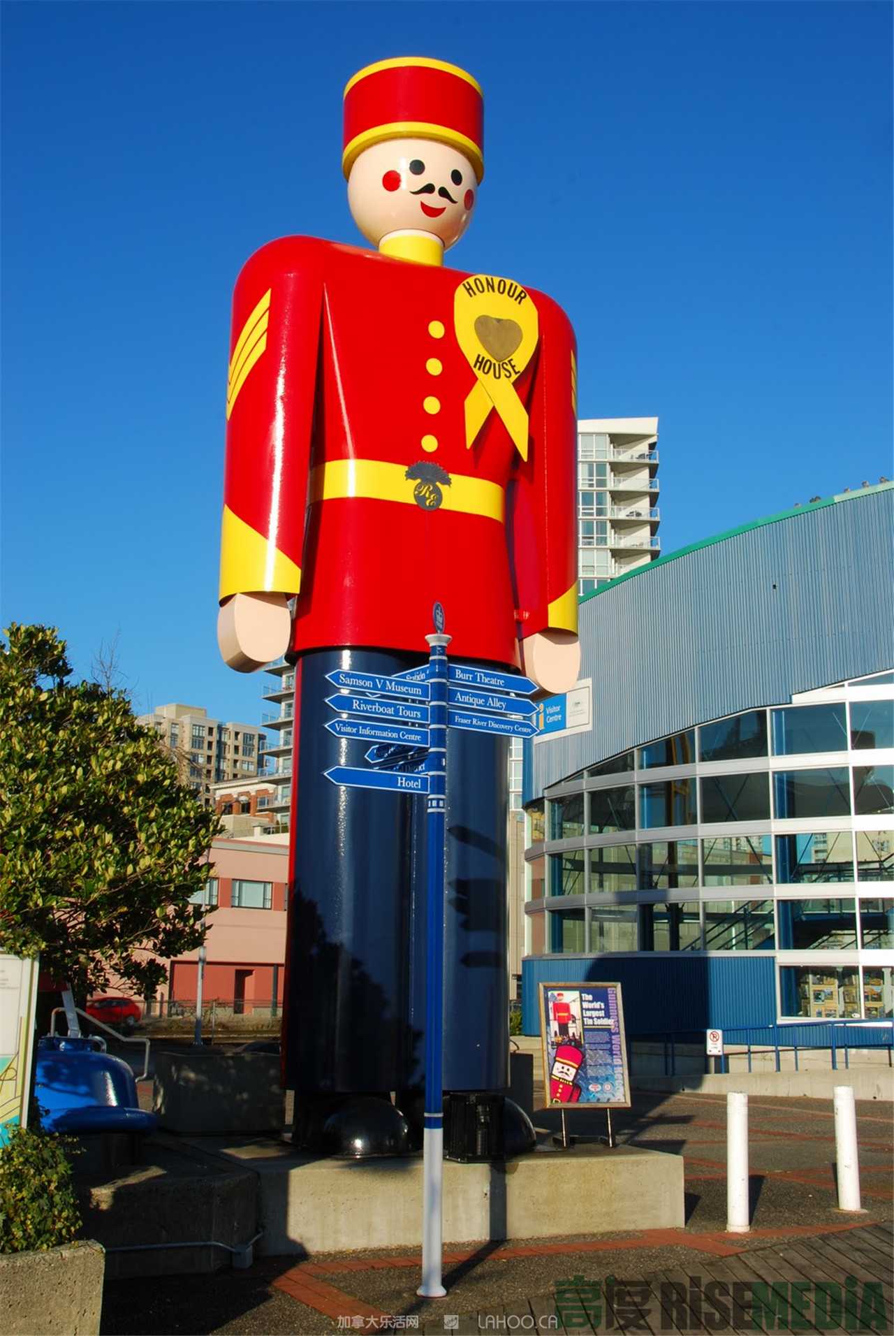 在新西敏菲沙河段步道,矗立着全世界最大的一尊用锡制成的雕像(Tin soldier),而且还上了吉尼斯世界纪录大全。但是仔细一看就非常不对劲,形象居然是英国士兵的模样。在加拿大处于被殖民统治的黑暗岁月,这些士兵肆意欺凌加拿大百姓。堂堂新西敏竟然为英国反动派招魂,不仅要砸掉这一雕像,更要打倒包庇反动派的市政府阎王殿,解放左翼红小鬼。